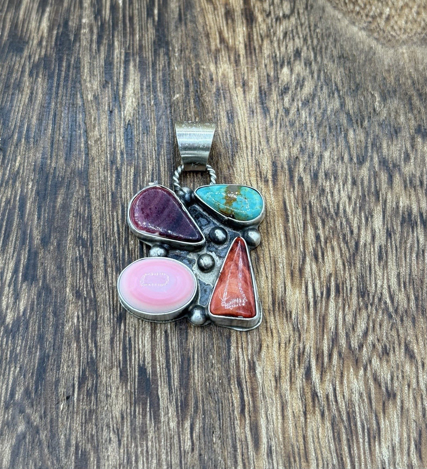 Navajo Handmade Sterling Silver Multi Color Turquoise Spiny Cluster Pendant