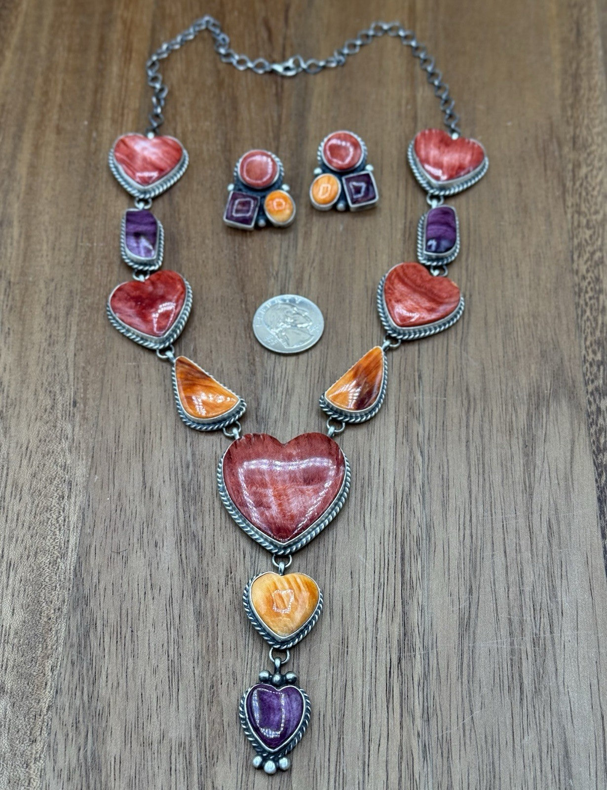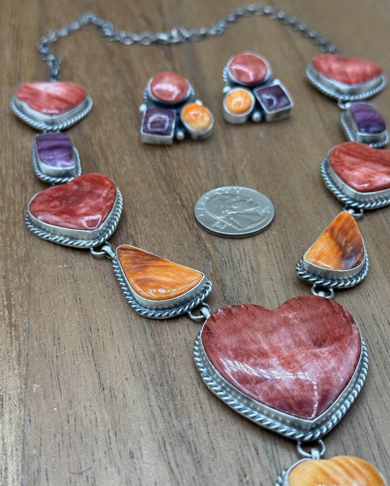 Navajo Handmade Sterling Silver Multi Spiny Oyster Shell Cluster Lariat Necklace