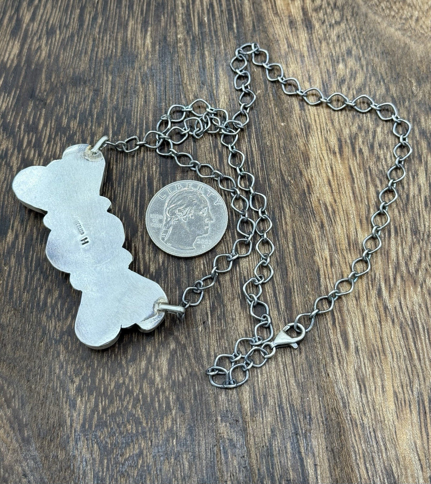 This exquisite cluster necklace is a true work of art handcrafted by Native American artisan Vicky Hicks, The stunning cluster shaped necklace features beautiful spiny oyster stones set in sterling silver bezel. The pendant hangs on an 18-inch chain with lobster closure, making it a perfect accessory for any occasion.