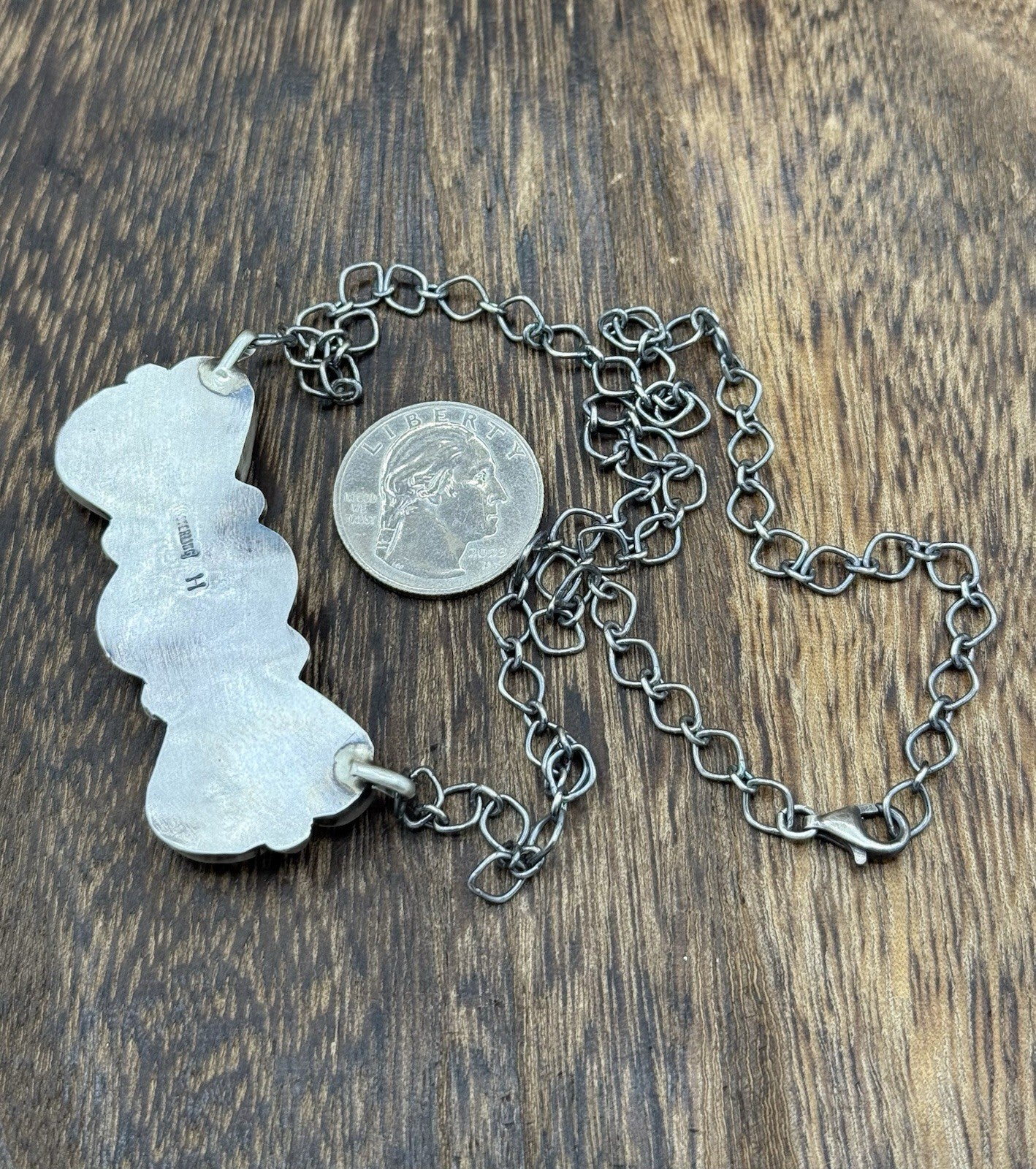 This exquisite cluster necklace is a true work of art handcrafted by Native American artisan Vicky Hicks, The stunning cluster shaped necklace features beautiful spiny oyster stones set in sterling silver bezel. The pendant hangs on an 18-inch chain with lobster closure, making it a perfect accessory for any occasion.