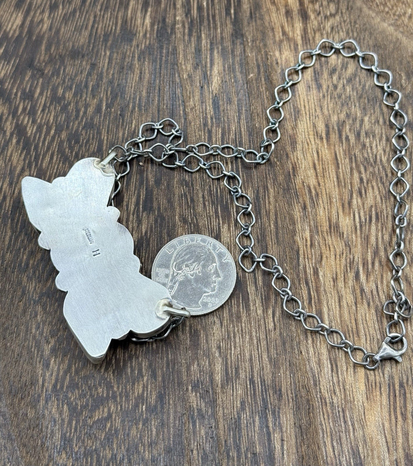 This exquisite cluster necklace is a true work of art handcrafted by Native American artisan Vicky Hicks, The stunning cluster shaped necklace features beautiful spiny oyster stones set in sterling silver bezel. The pendant hangs on an 18-inch chain with lobster closure, making it a perfect accessory for any occasion.