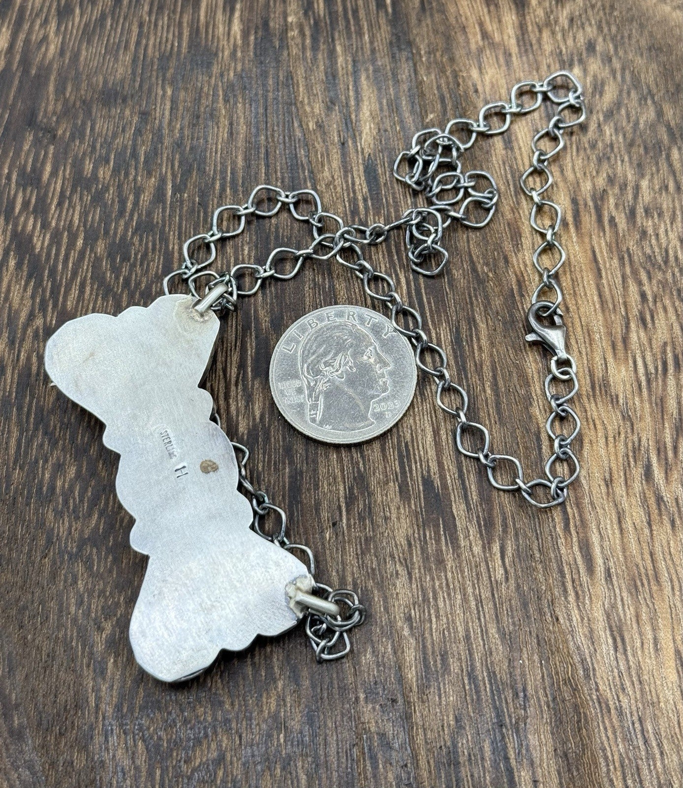 This exquisite cluster necklace is a true work of art handcrafted by Native American artisan Vicky Hicks, The stunning cluster shaped necklace features beautiful spiny oyster stones set in sterling silver bezel. The pendant hangs on an 18-inch chain with lobster closure, making it a perfect accessory for any occasion.