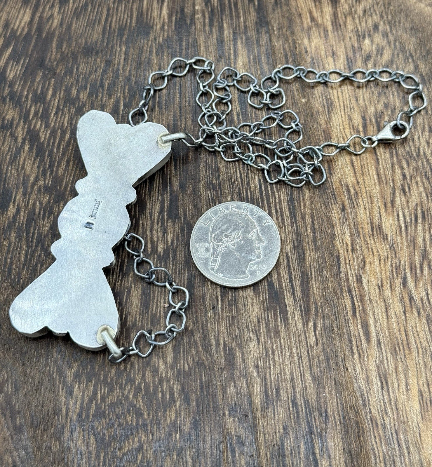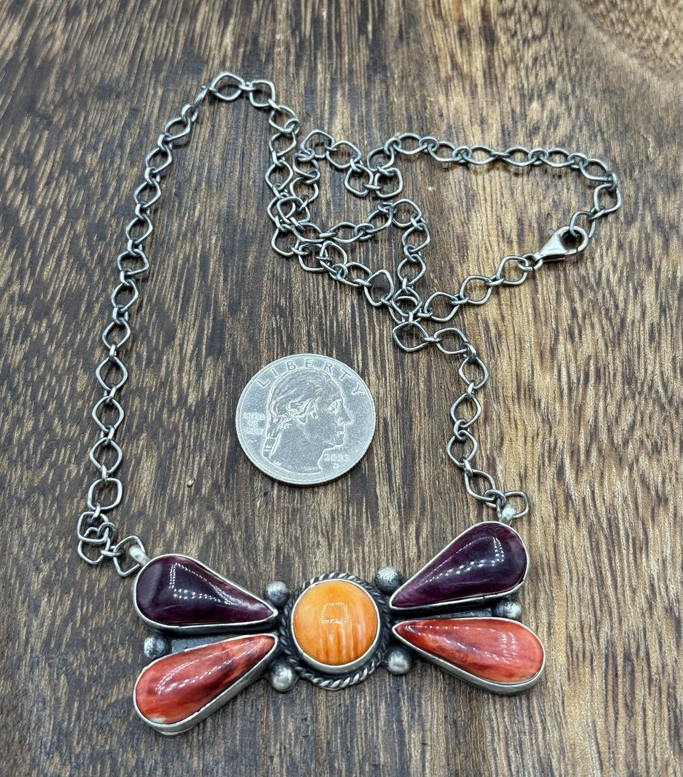 This exquisite cluster necklace is a true work of art handcrafted by Native American artisan Vicky Hicks, The stunning cluster shaped necklace features beautiful spiny oyster stones set in sterling silver bezel. The pendant hangs on an 18-inch chain with lobster closure, making it a perfect accessory for any occasion.