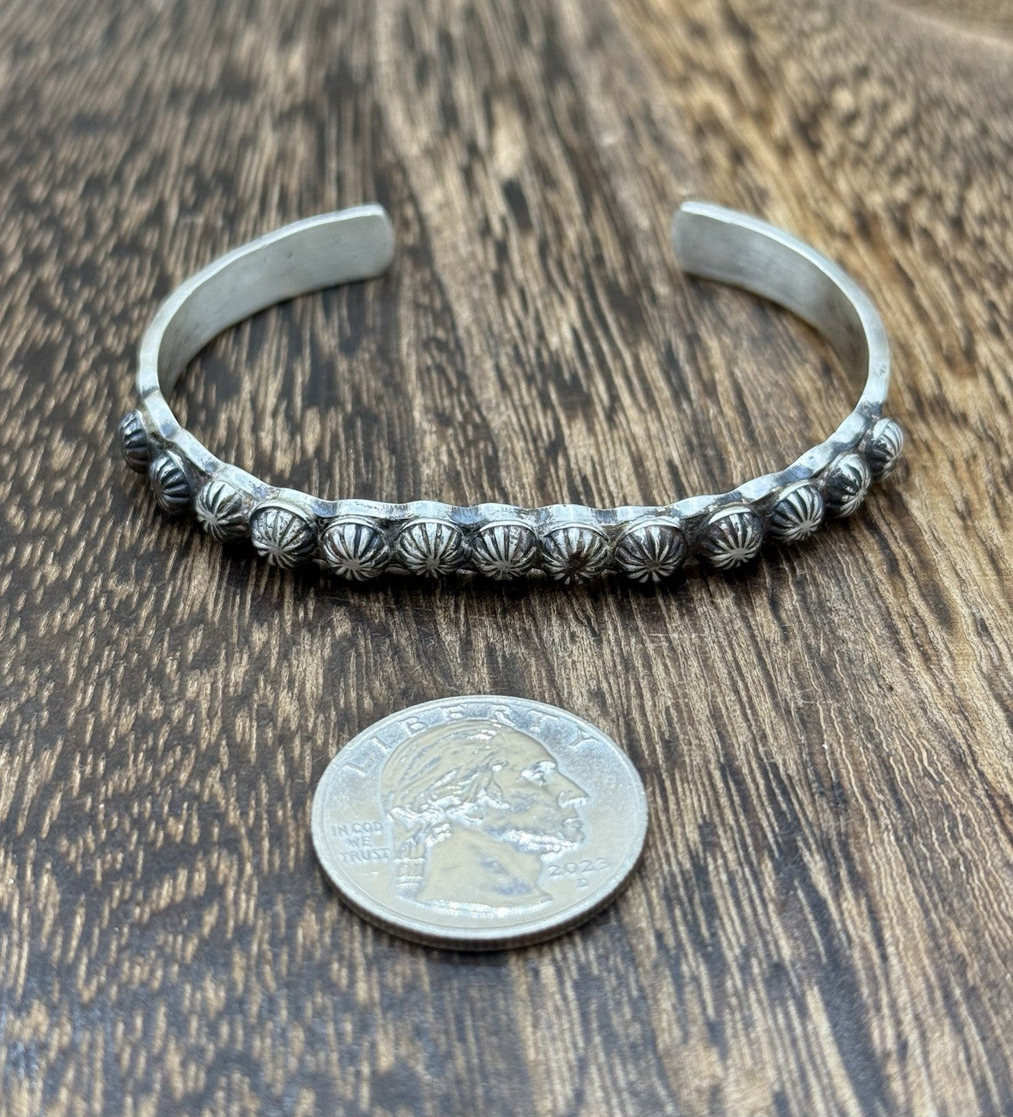 This Native American handmade cuff bracelet features an old look concho stamped design. The intricate design and attention to detail make this bracelet a true beauty. The Navajo tribal affiliation adds to the authenticity and uniqueness of this piece.