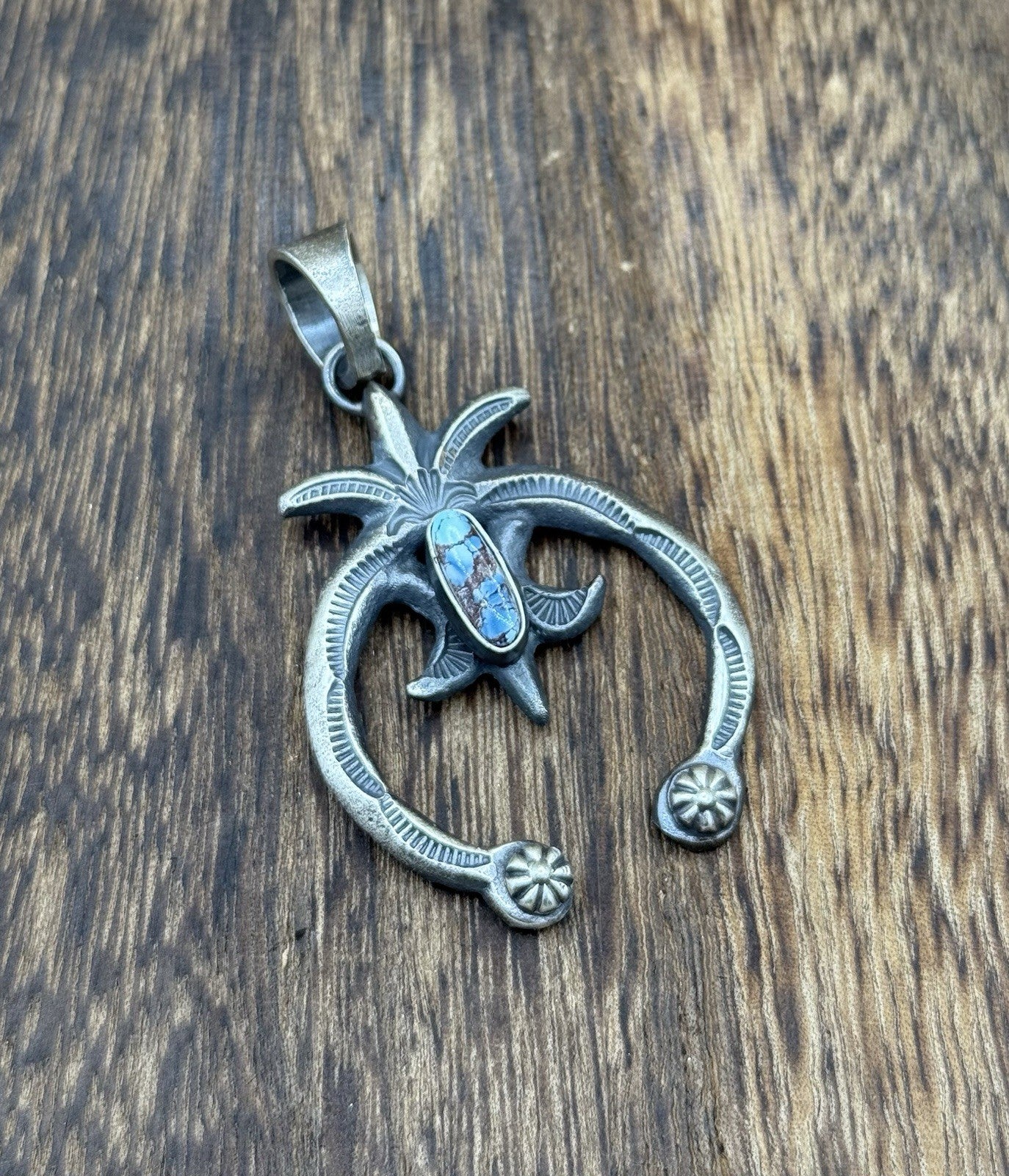 Navajo Handmade Sterling Silver Old Look Golden Hills Turquoise Naja Pendant