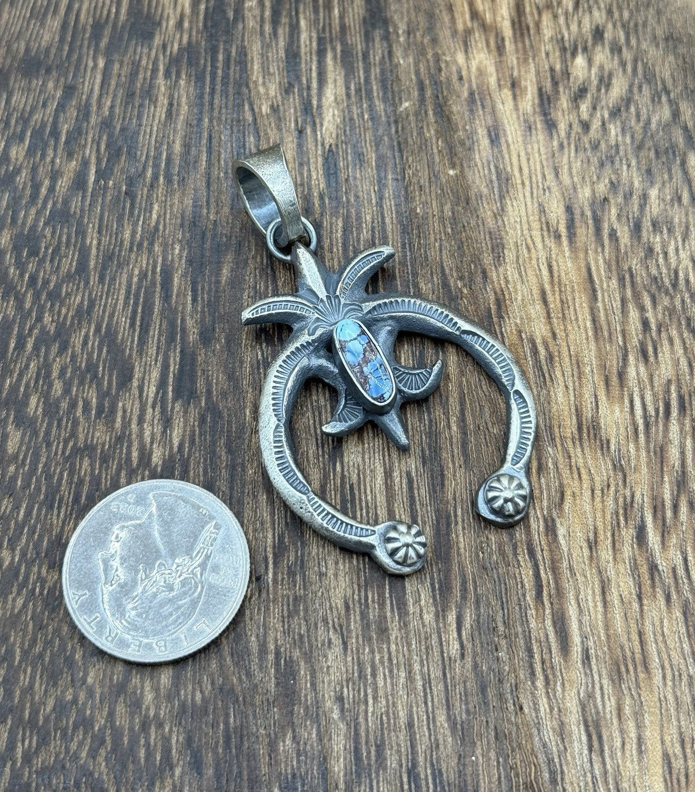 This beautiful pendant is a true work of art. Cast Handmade by Kevin Billah, a Native American artisan, it features a unique dangle shape and a bezel setting style. The pendant is made of 925 sterling silver and adorned with a stunning golden hills turquoise stone.
