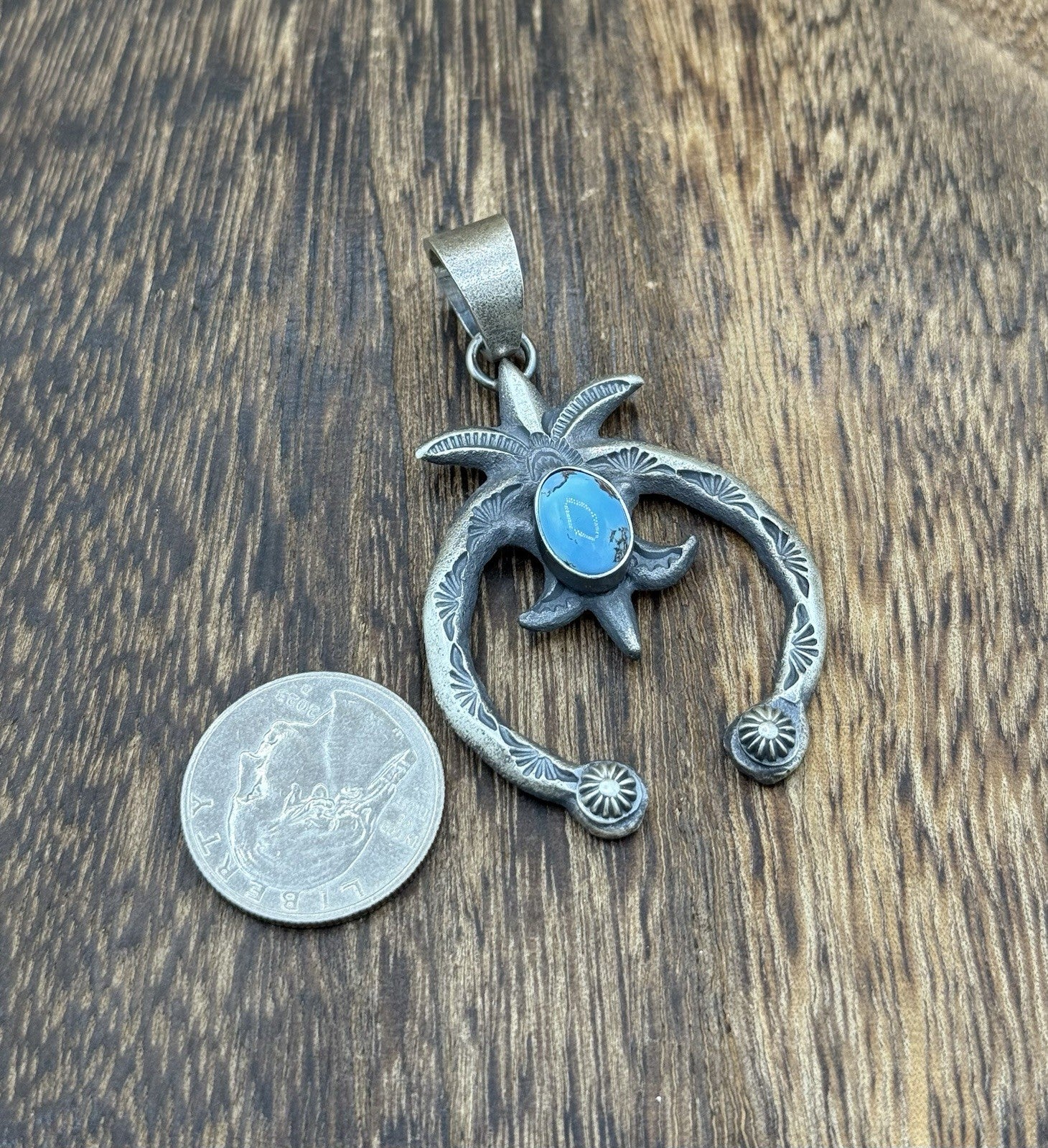 This beautiful pendant is a true work of art. Cast Handmade by Kevin Billah, a Native American artisan, it features a unique dangle shape and a bezel setting style. The pendant is made of 925 sterling silver and adorned with a stunning golden hills turquoise stone.