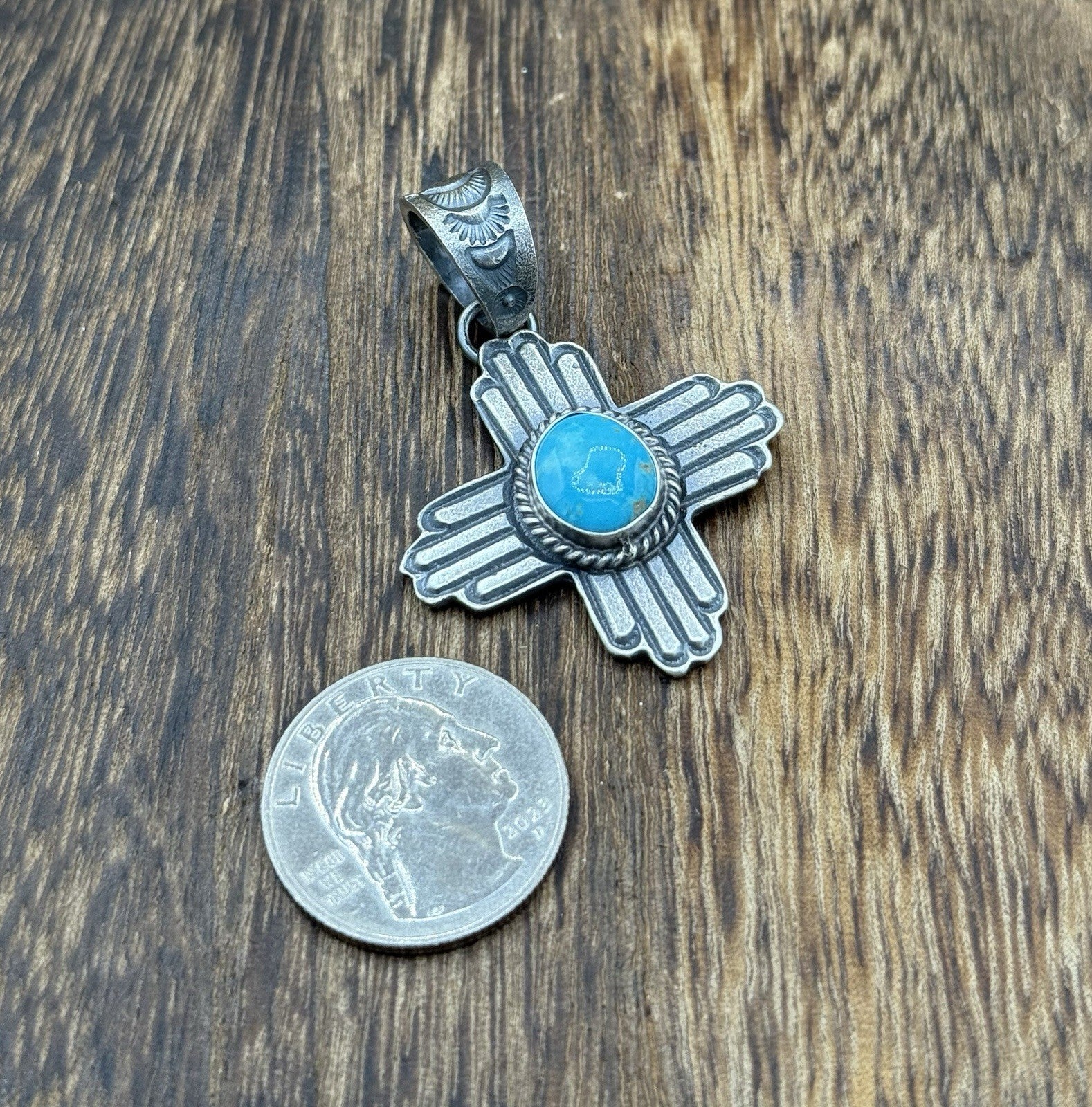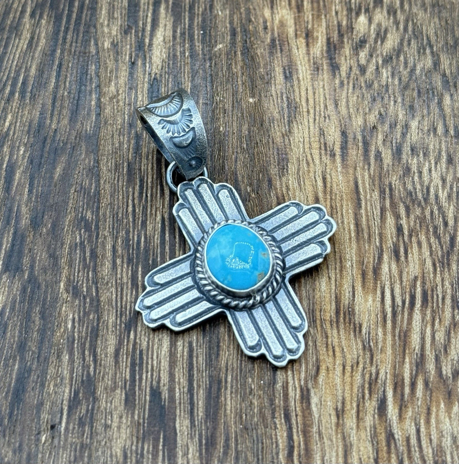 Navajo Handmade Sterling Silver Old Look Kingman Turquoise Zia Pendant Kevin B.