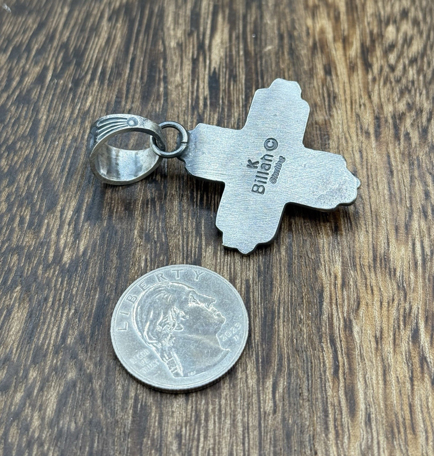 This beautiful pendant is a true work of art. Cast Handmade by Kevin Billah, a Native American artisan, it features a unique dangle shape and a bezel setting style. The pendant is made of 925 sterling silver and adorned with a stunning kingman turquoise stone.