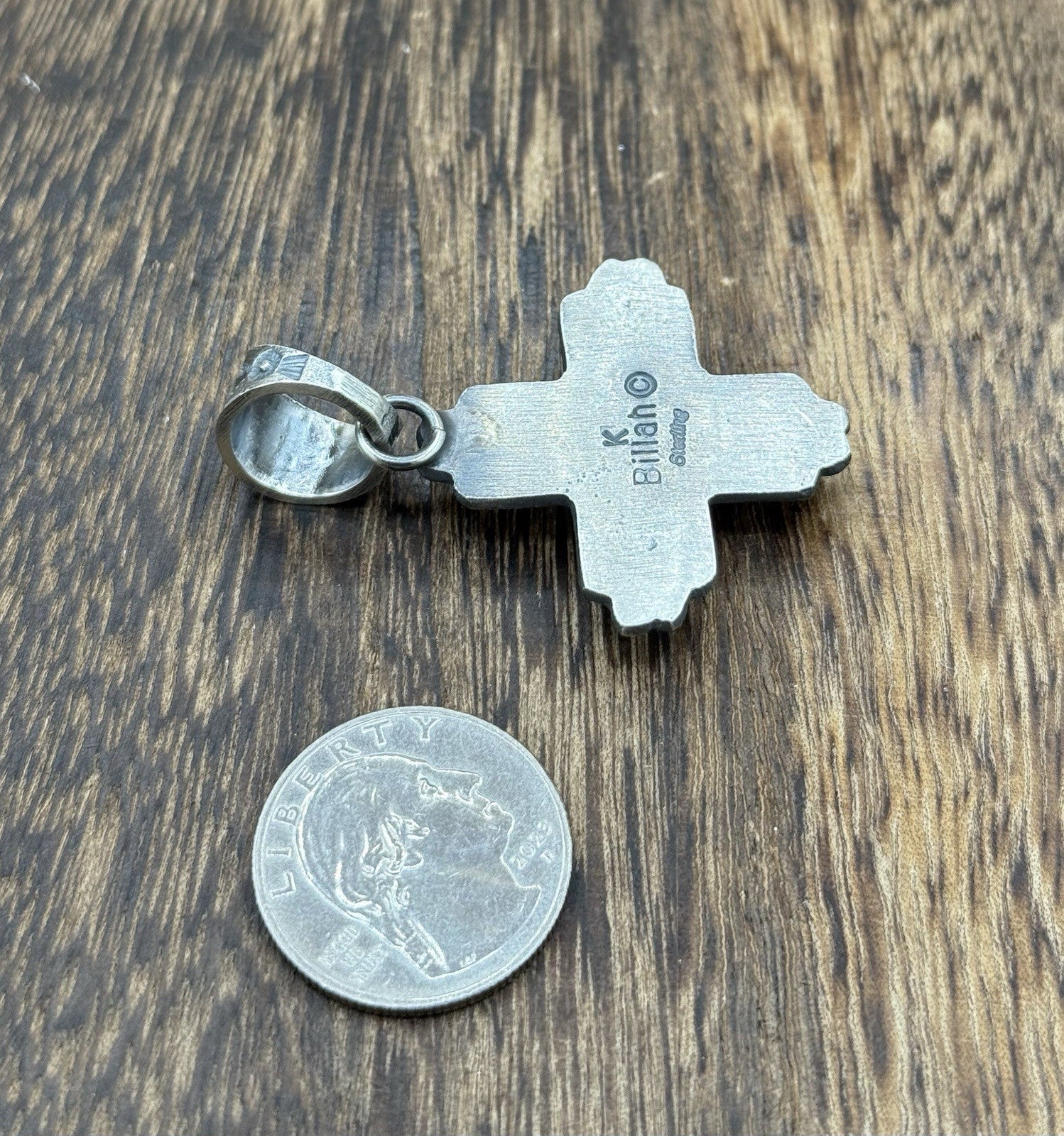 Navajo Handmade Sterling Silver Old Look Kingman Turquoise Zia Pendant Kevin B.