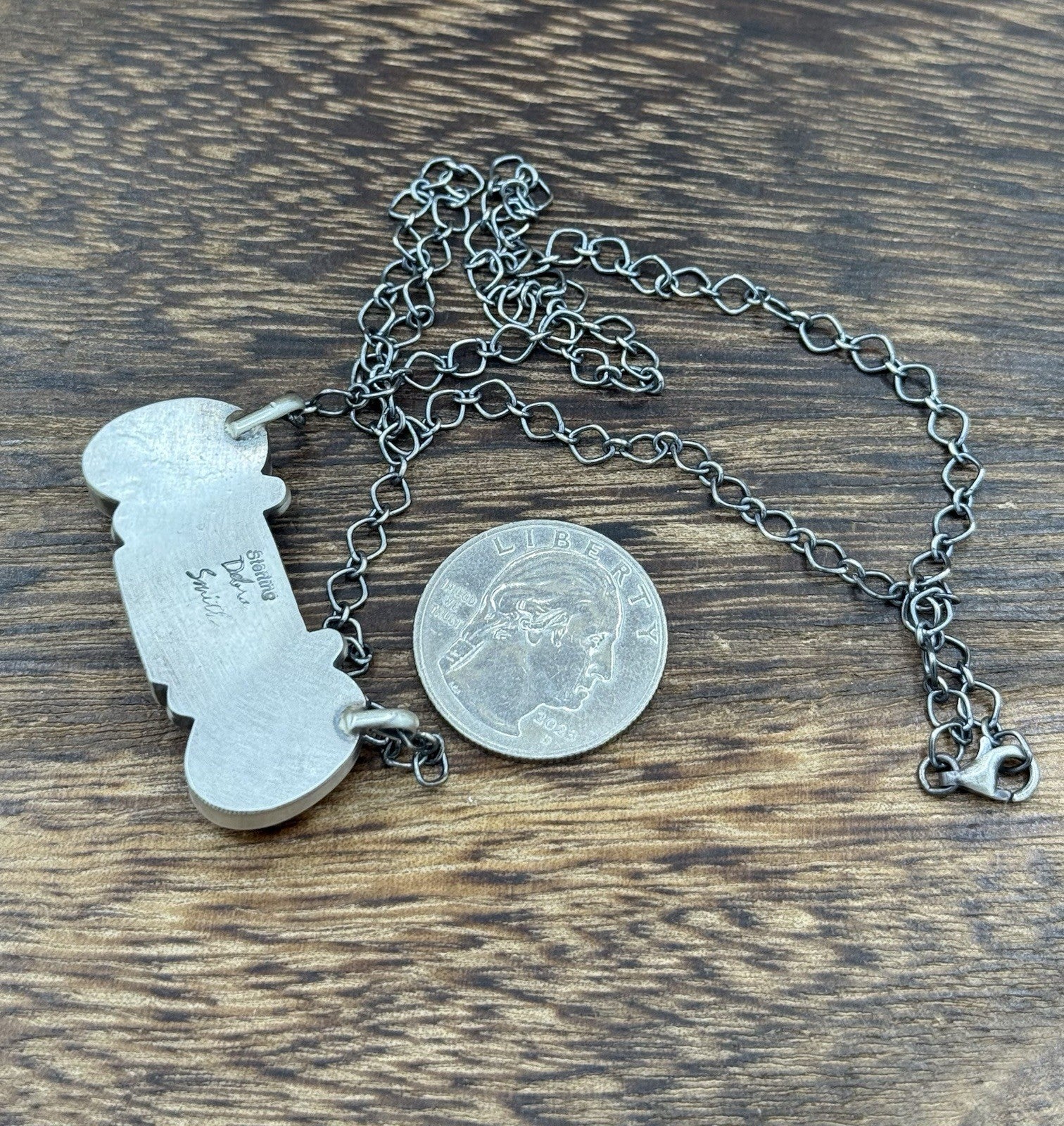 This exquisite necklace is a true work of art handcrafted by Native American Debra Smtih, The stunning cluster bar shaped necklace features beautiful spiny oyster shell stones set in sterling silver bezel. The pendant hangs on an 18-inch chain with lobster closure, making it a perfect accessory for any occasion.