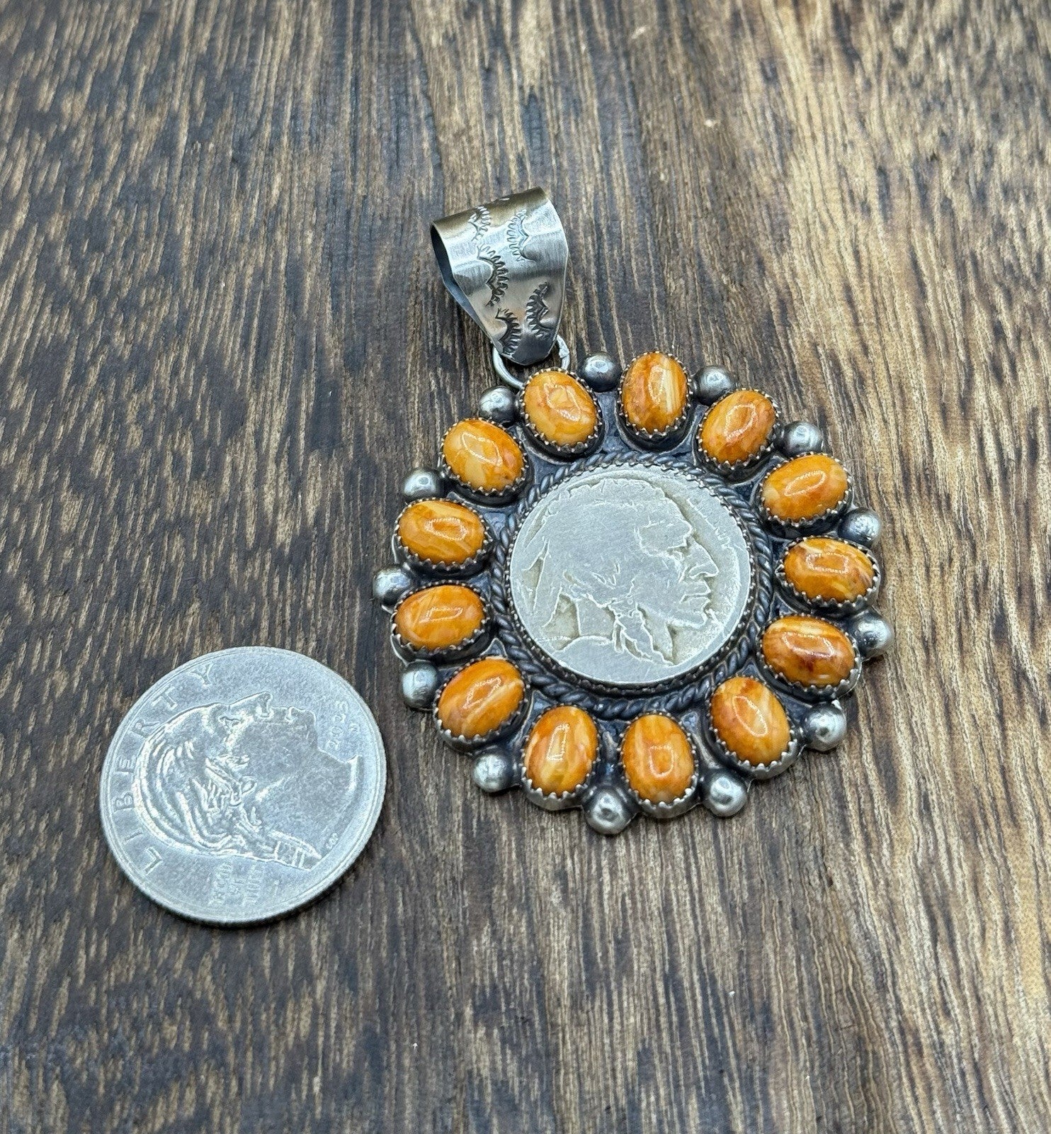 Navajo Handmade Sterling Silver Orange Spiny Oyster Cluster Buffalo Coin Pendant