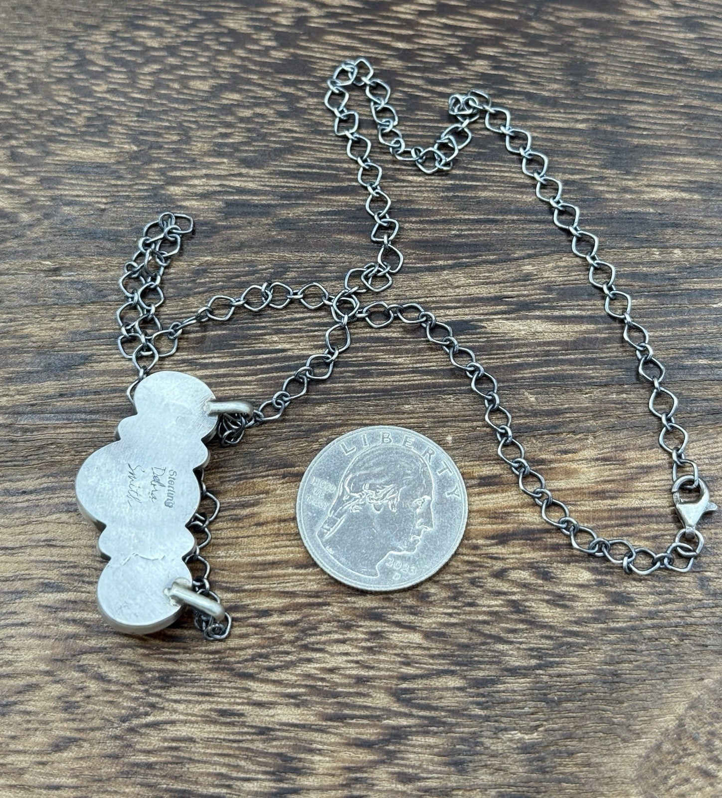 This exquisite necklace is a true work of art handcrafted by Native American Debra Smtih, The stunning cluster bar shaped necklace features beautiful pink conch shell stones set in sterling silver bezel. The pendant hangs on an 18-inch chain with lobster closure, making it a perfect accessory for any occasion.
