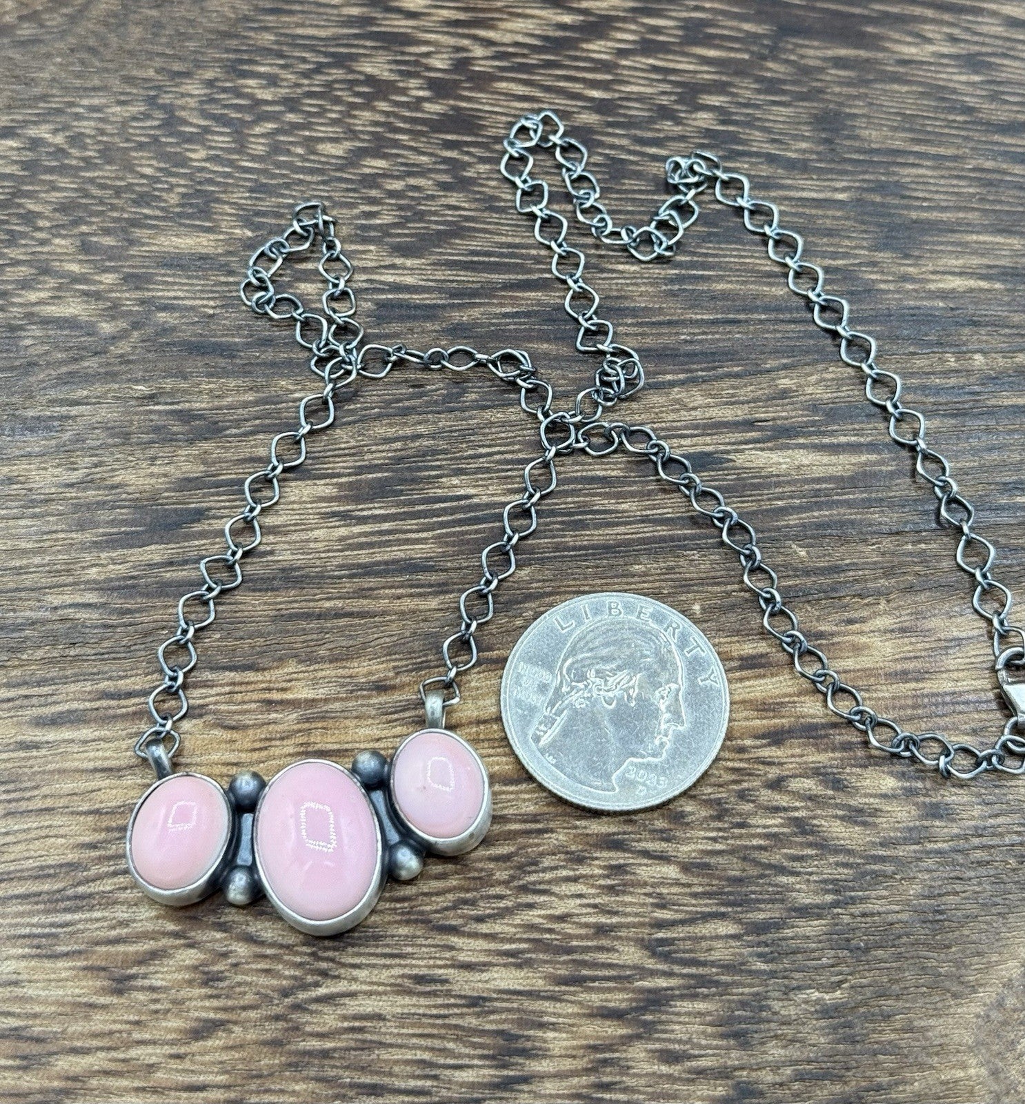 Navajo Handmade Sterling Silver Pink Conch Shell Cluster Bar Necklace 18”