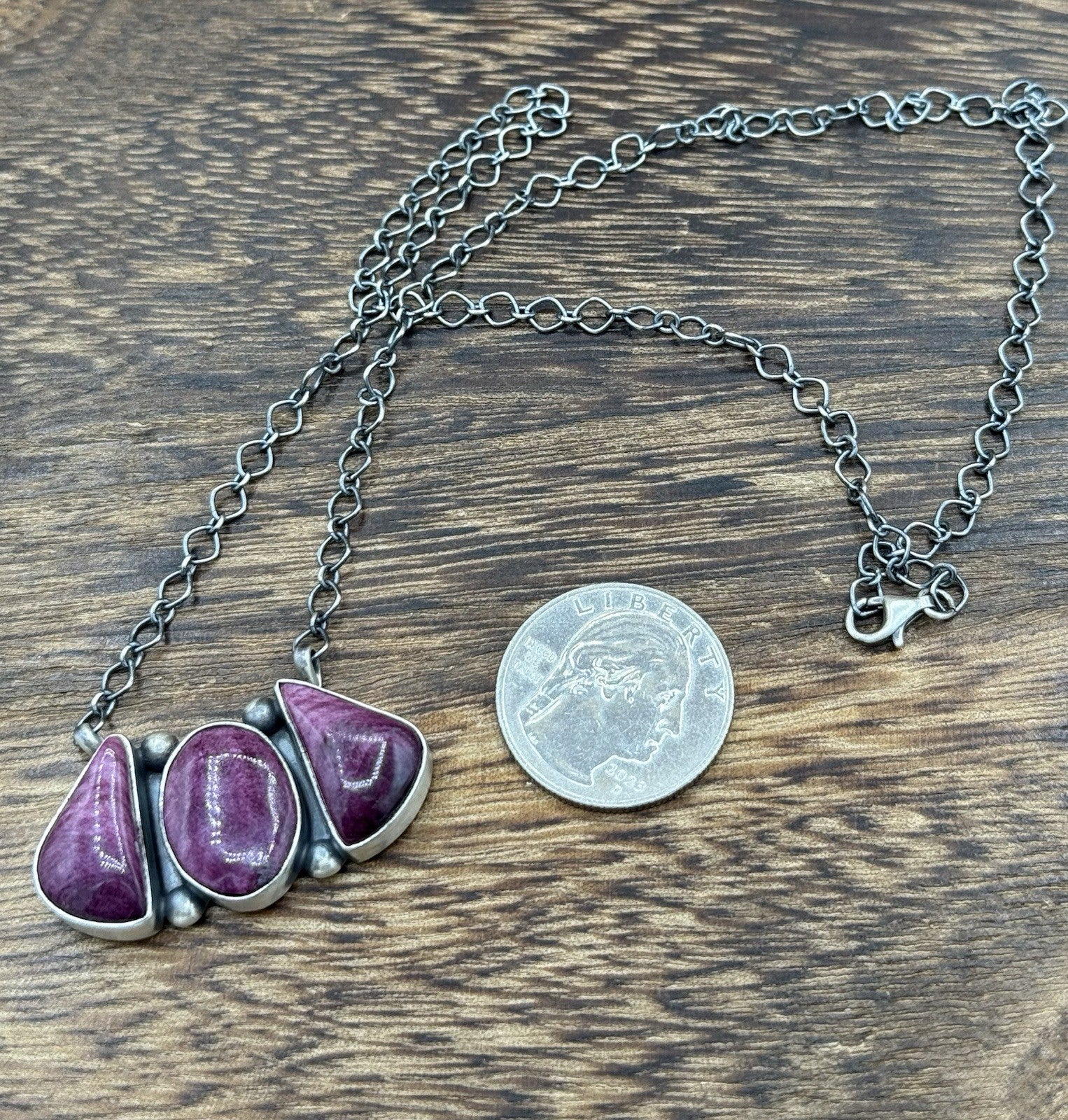 Navajo Handmade Sterling Silver Purple Spiny Oyster Cluster Bar Necklace 18”