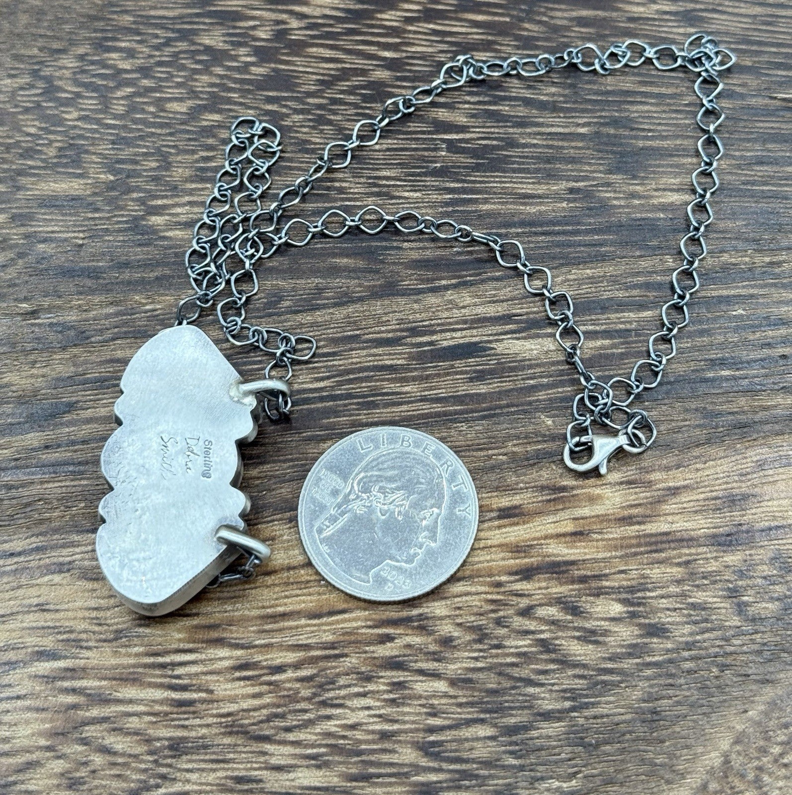 This exquisite necklace is a true work of art handcrafted by Native American Debra Smtih, The stunning cluster bar shaped necklace features beautiful spiny oyster shell stones set in sterling silver bezel. The pendant hangs on an 18-inch chain with lobster closure, making it a perfect accessory for any occasion.