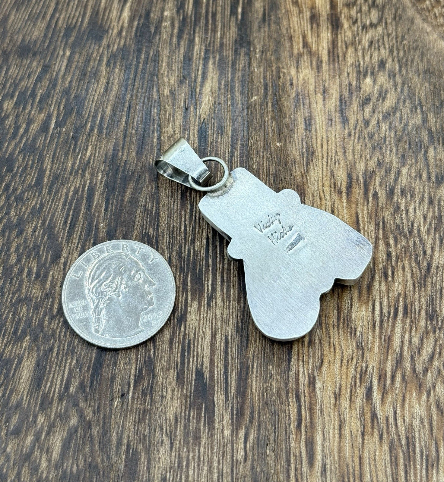 Elevate your jewelry collection with this exquisite Navajo handmade pendant. Crafted by Vicky Hicks, this stunning piece features spiny oyster shell stones, set in a sterling silver setting.