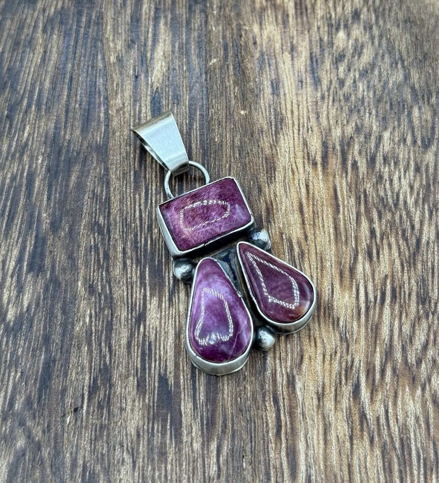 Navajo Handmade Sterling Silver Purple Spiny Oyster Shell Cluster Drop Pendant