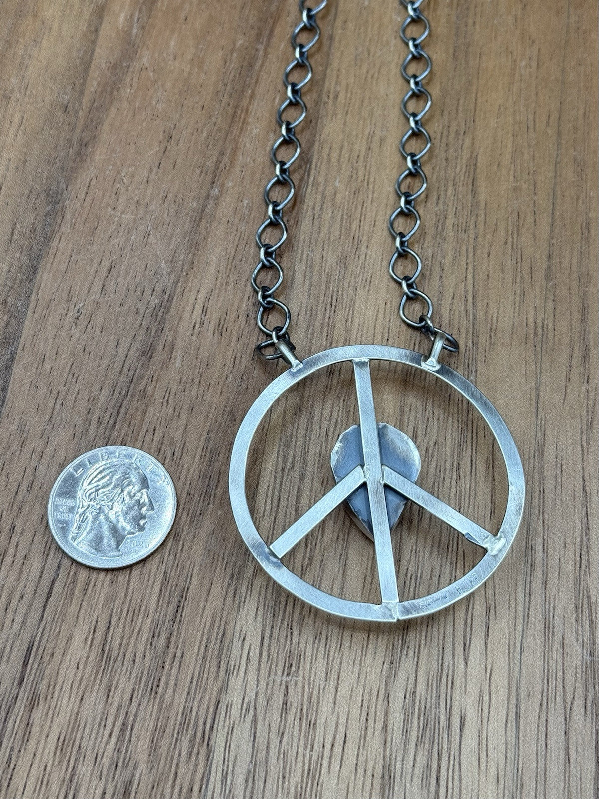 This unique necklace is a beautiful piece of Native American jewelry. Handmade by Navajo artisan Betta Lee, it features a peace pendant on chain all crafted from .925 sterling silver and adorned with a natural Red spiny oyster stone. The necklace is 18 inches long and comes with a lobster closure.