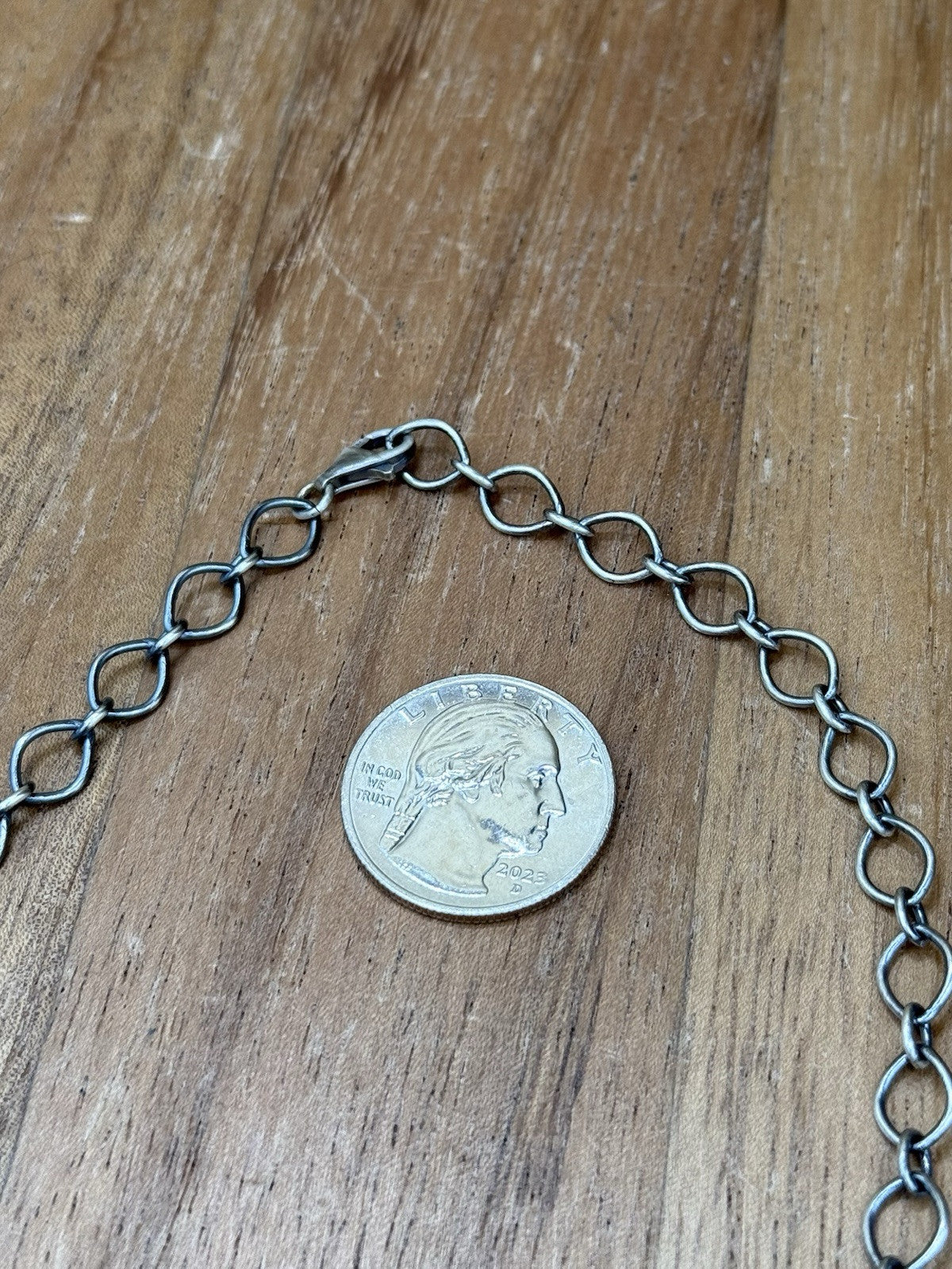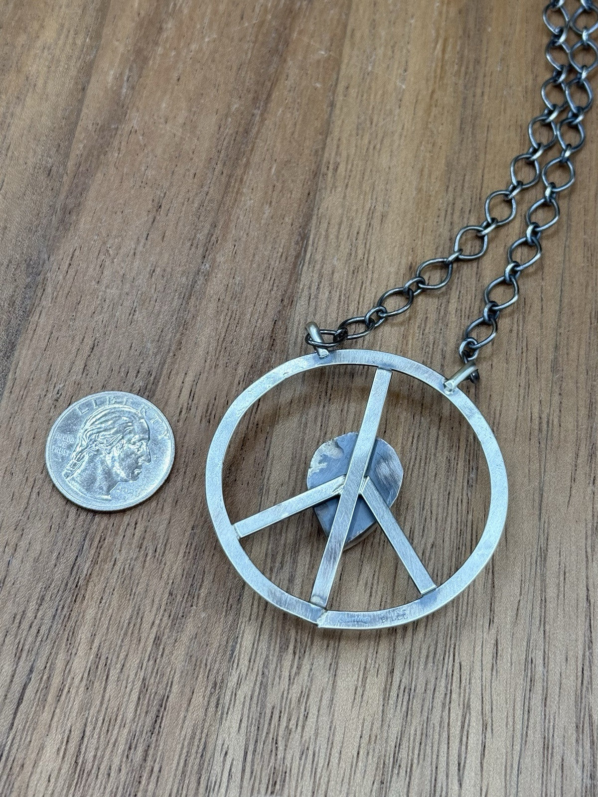 This unique necklace is a beautiful piece of Native American jewelry. Handmade by Navajo artisan Betta Lee, it features a peace pendant on chain all crafted from .925 sterling silver and adorned with a natural Red spiny oyster stone. The necklace is 18 inches long and comes with a lobster closure.
