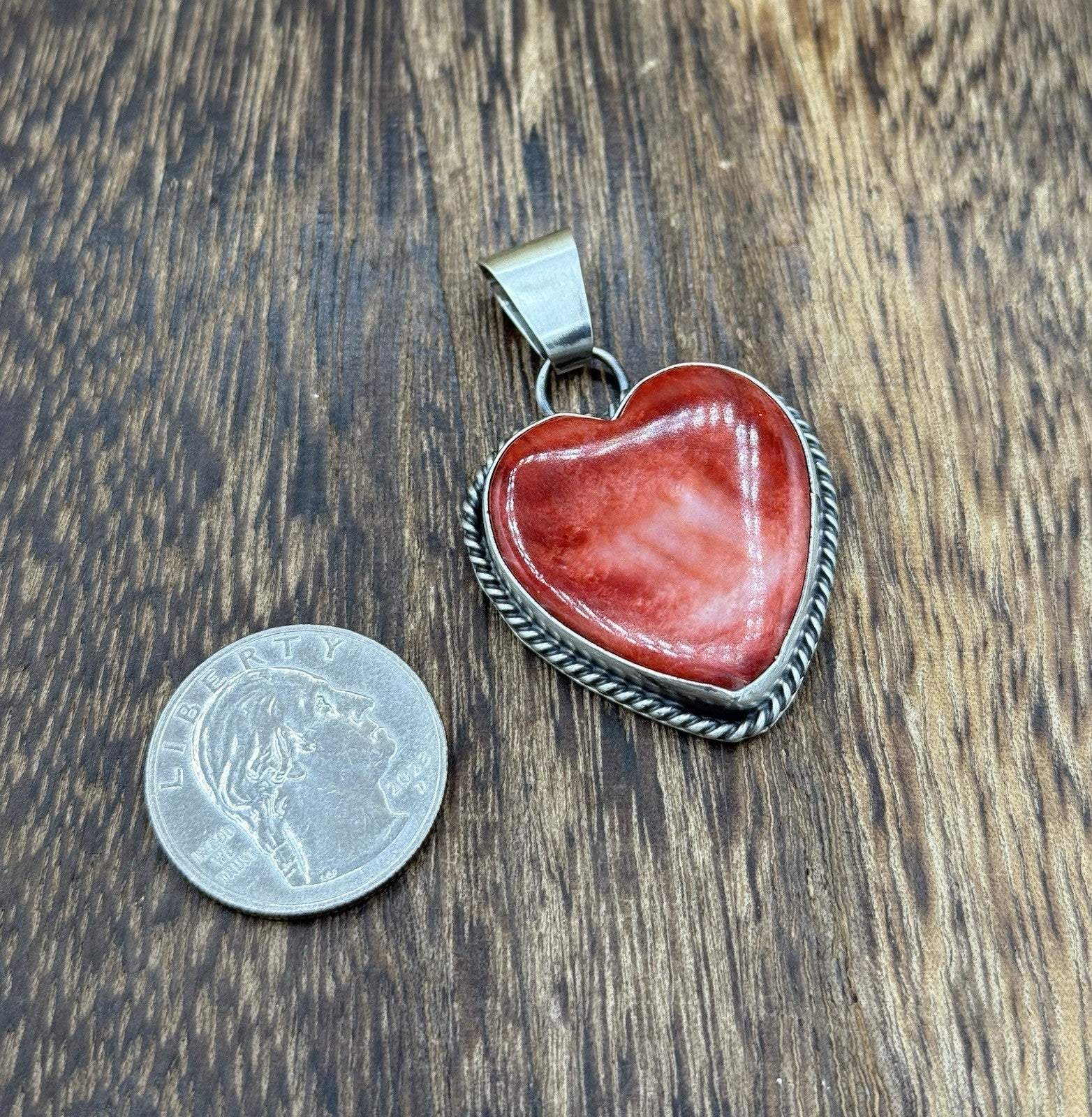 Navajo Handmade Sterling Silver Red Spiny Oyster Shell Heart Shaped Pendant