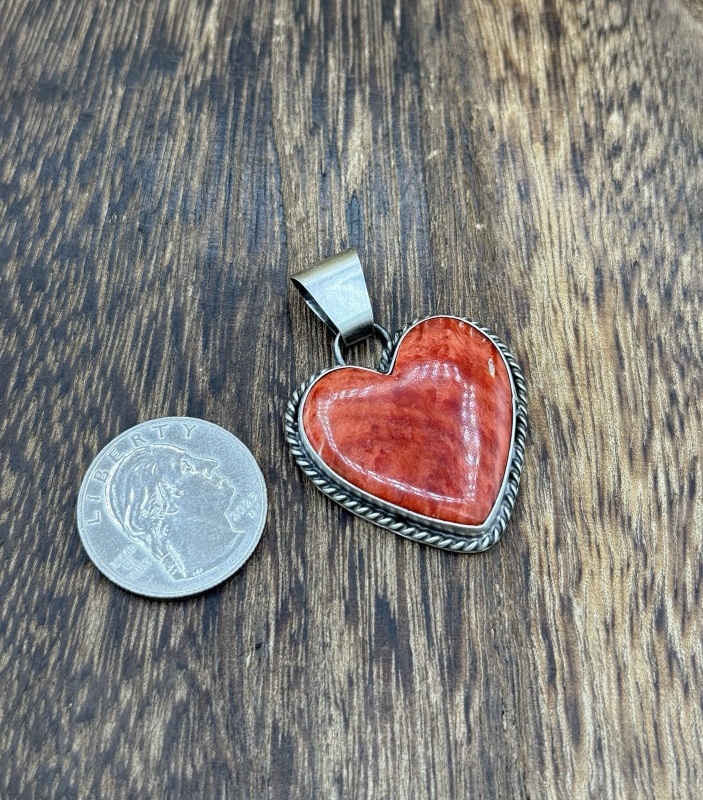 Navajo Handmade Sterling Silver Red Spiny Oyster Shell Heart Shaped Pendant