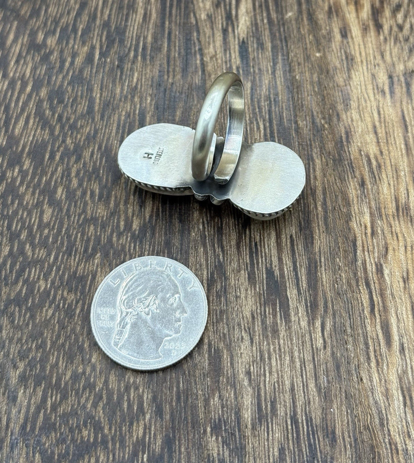 This is a handmade Native american ring made by Vicky Hicks. The ring is adorned with Royston turquoise. The ring is adjustable from size 7 to size 9