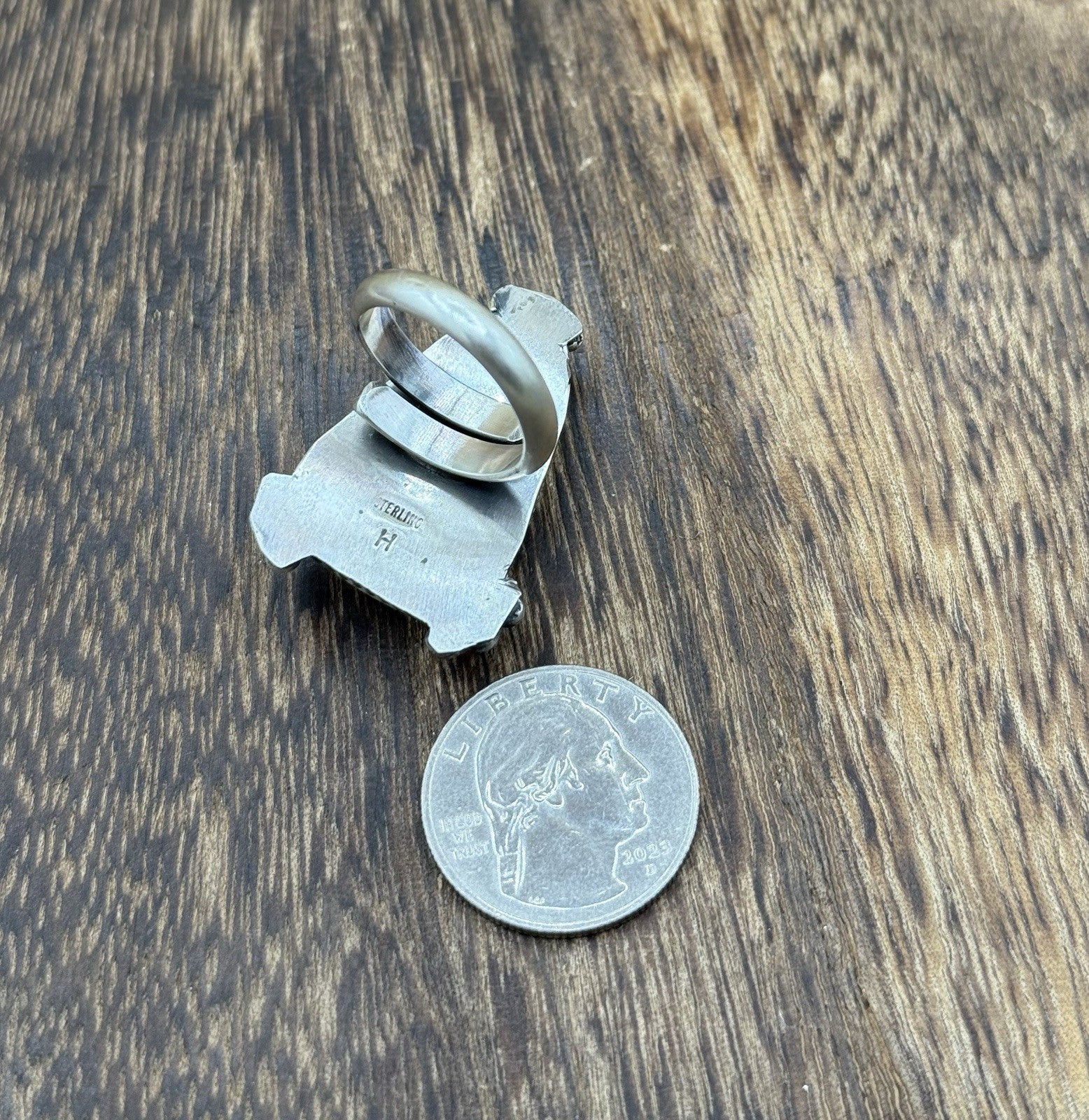This is a handmade Native american ring made by Vicky Hicks. The ring is adorned with Royston turquoise. The ring is adjustable from size 8 to size 10