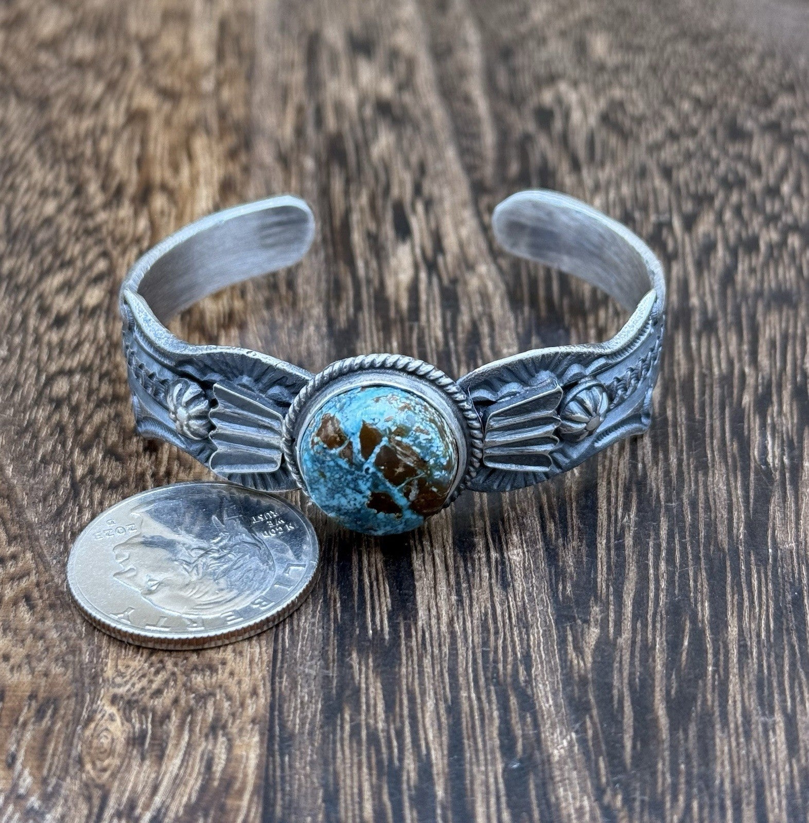 This stunning bracelet is a piece of Native American artistry at its finest. Handmade/casted by Kevin Billah, this sterling silver cuff features a beautiful Royston turquoise stone set in bezel. The bracelet has a unique shape and is perfect for any occasion, from Mother's Day to weddings and graduations.