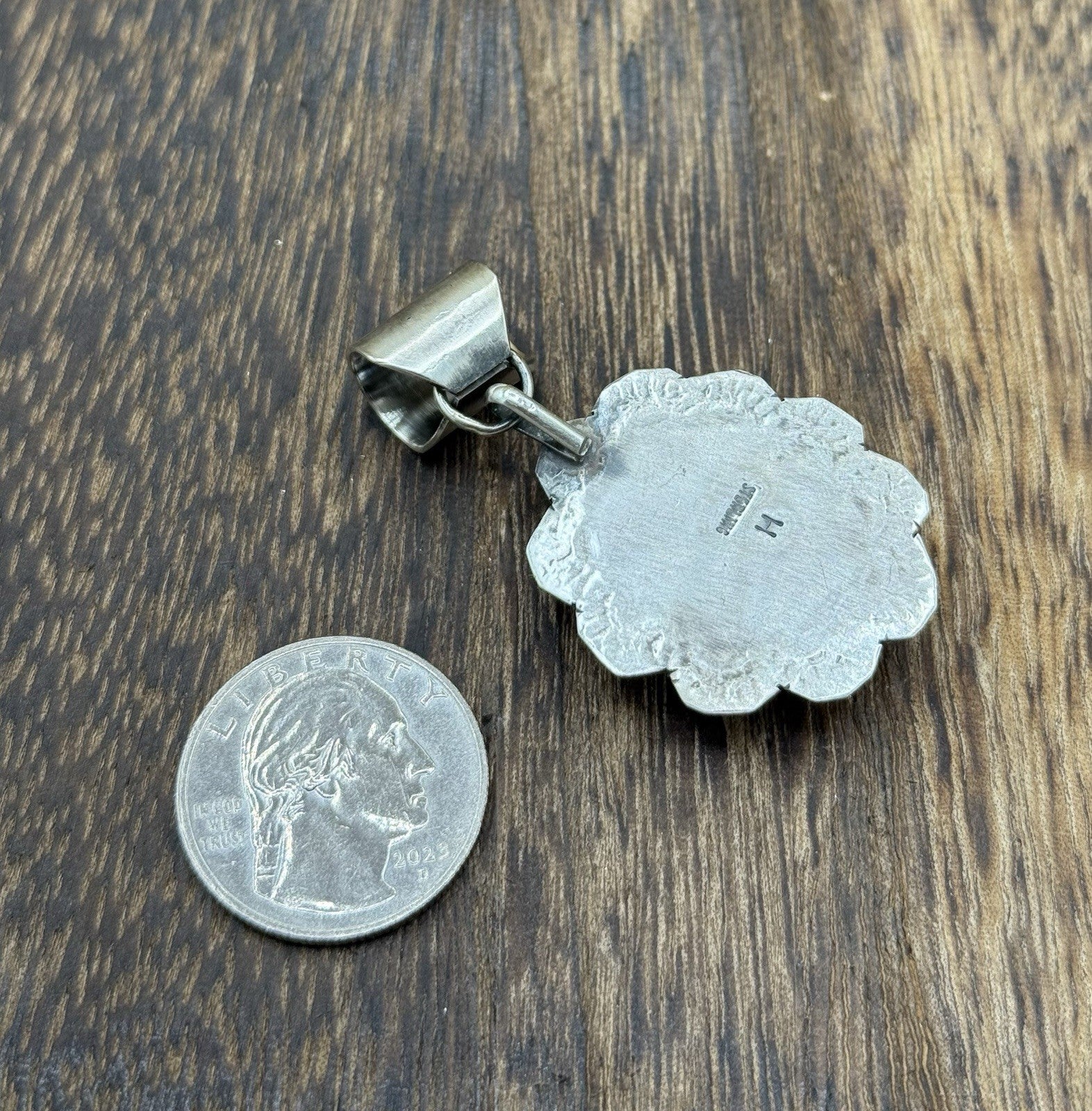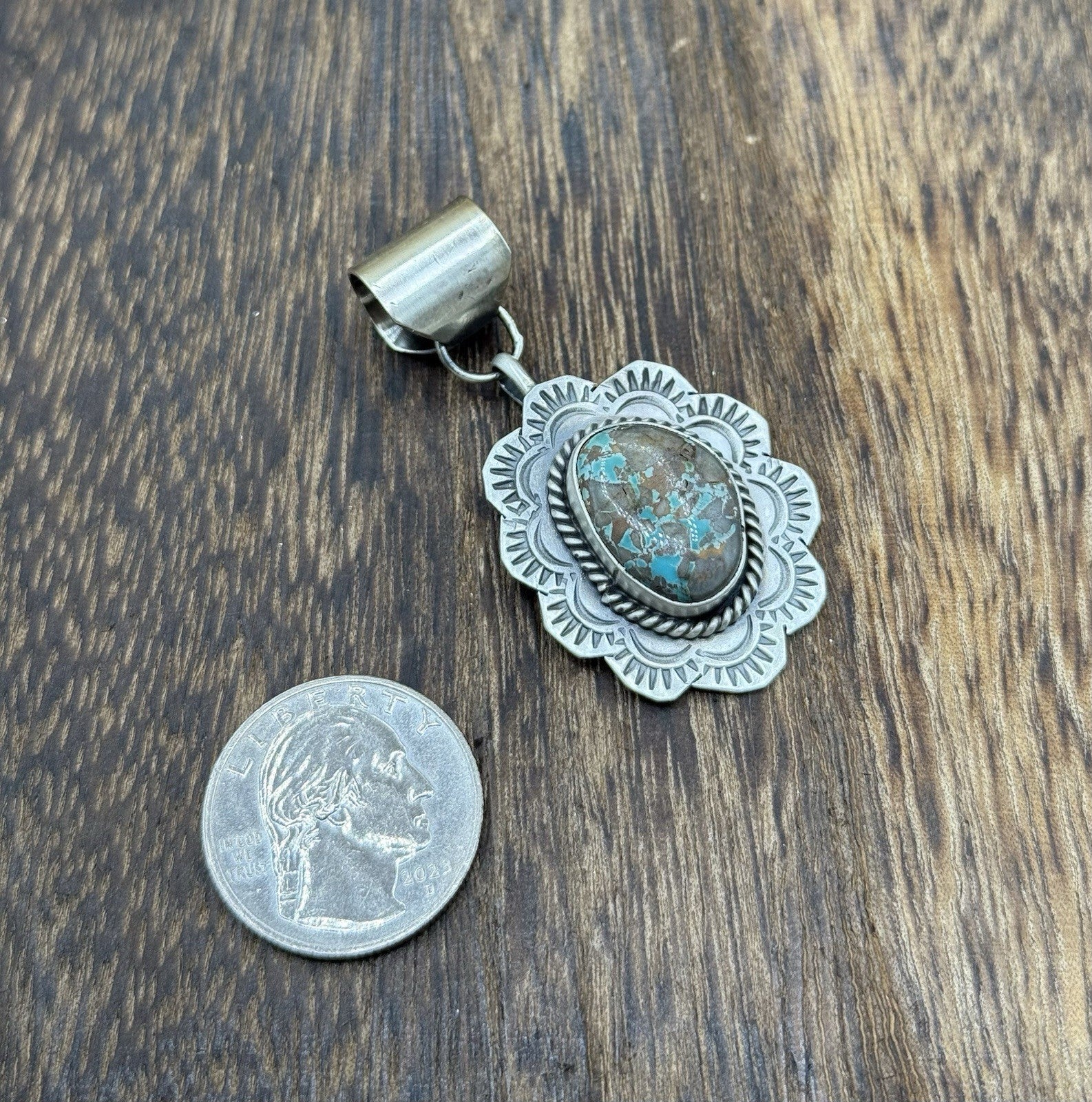 Navajo Handmade Sterling Silver Royston Turquoise Stamped Design Drop Pendant