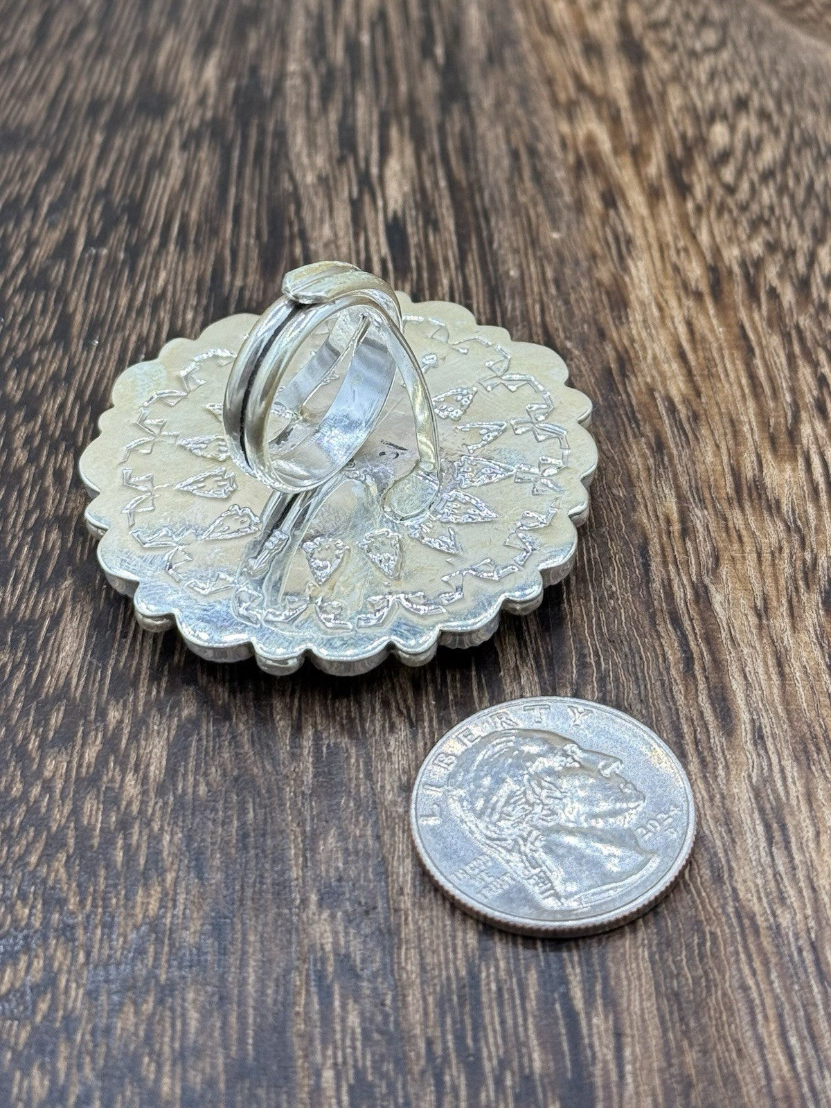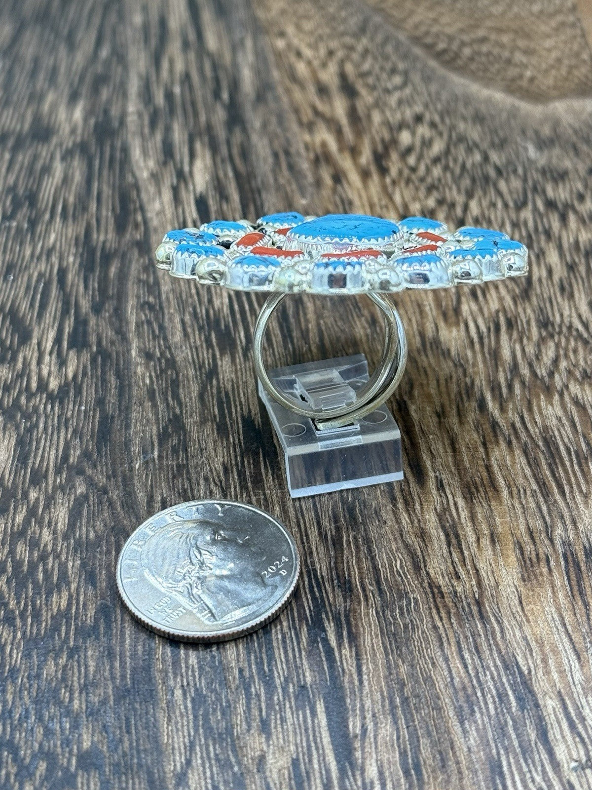 This is a Native American Navajo handmade ring made by Bryan Jones. The ring is adorned with Sleeping Beauty Turquoise & Red Coral Stones. The ring is adjustable from size 6 to 9