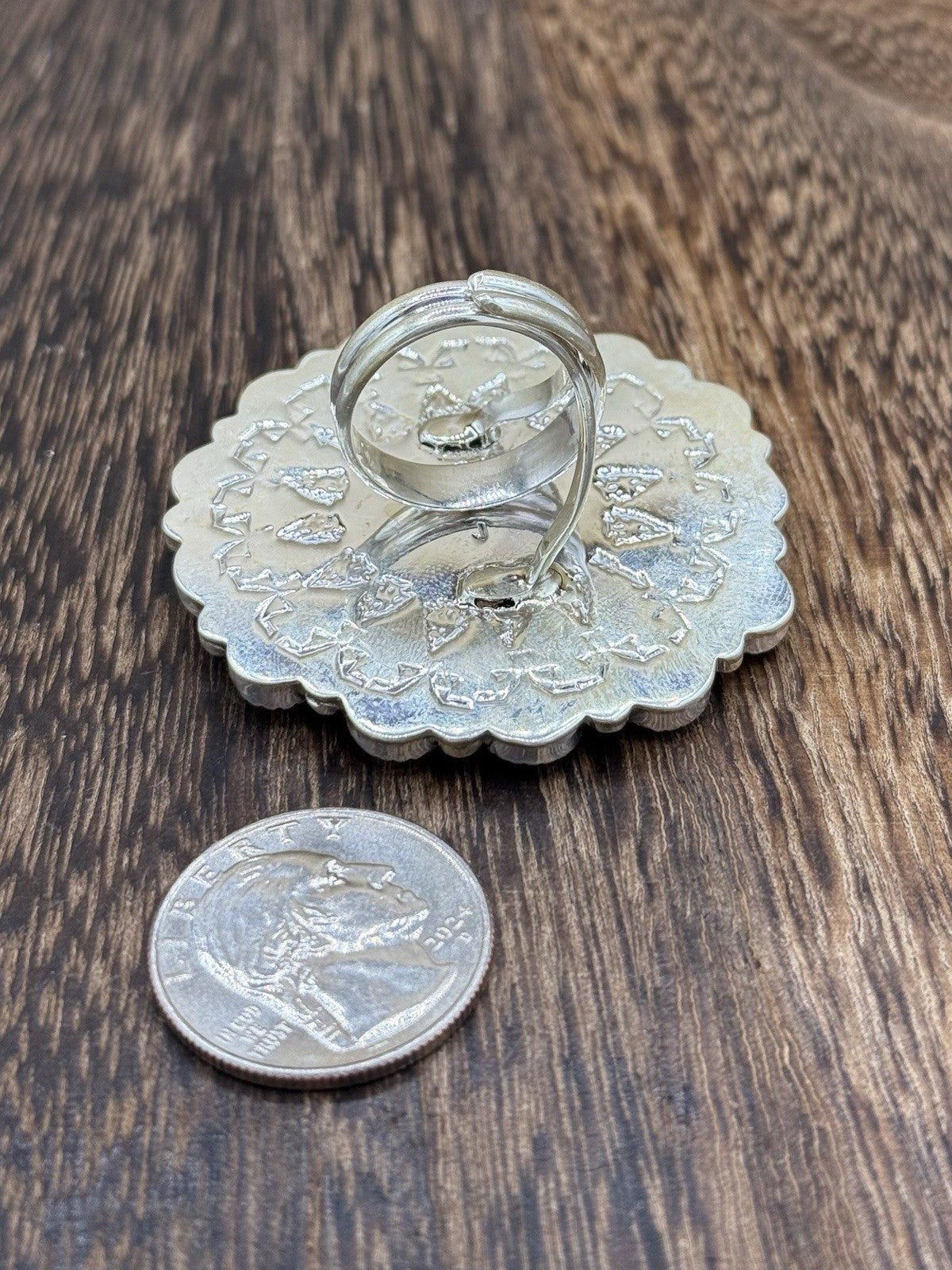 This is a Native American Navajo handmade ring made by Bryan Jones. The ring is adorned with Sleeping Beauty Turquoise & Red Coral Stones. The ring is adjustable from size 6 to 9
