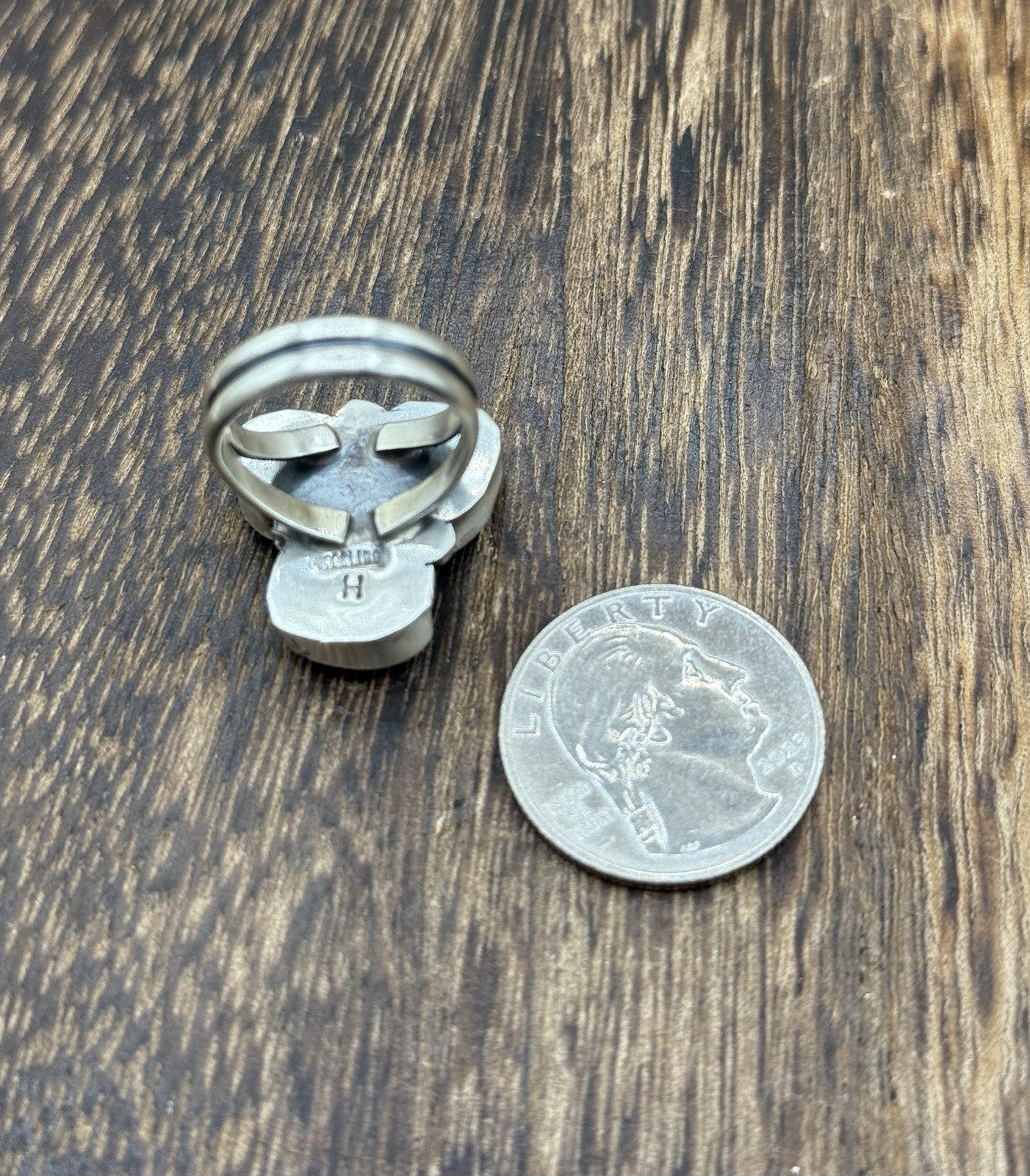 This is a handmade Native american ring made by artist Vicky Hicks. The ring is adorned with Sonoran gold turquoise stones and sterling silver.