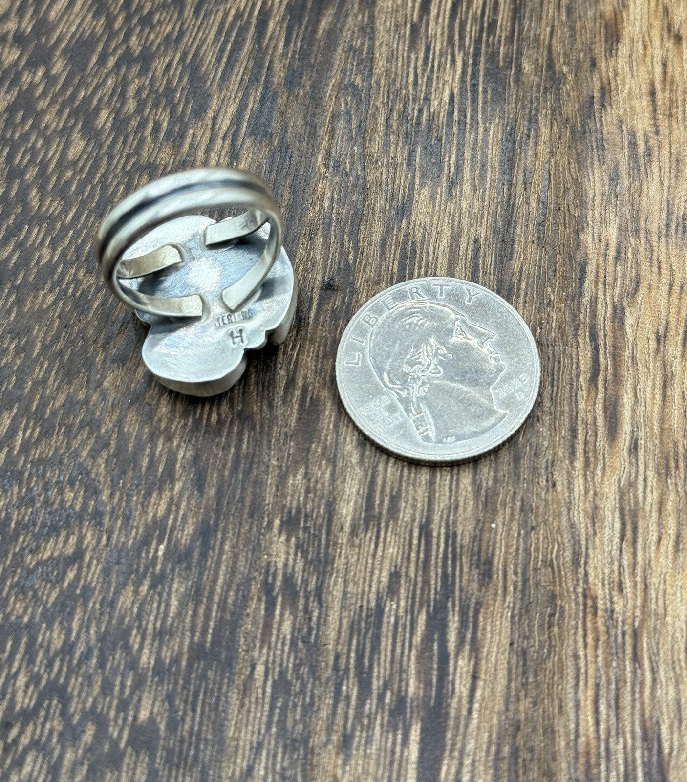 This is a handmade Native american ring made by artist Vicky Hicks. The ring is adorned with Sonoran gold turquoise stones and sterling silver.