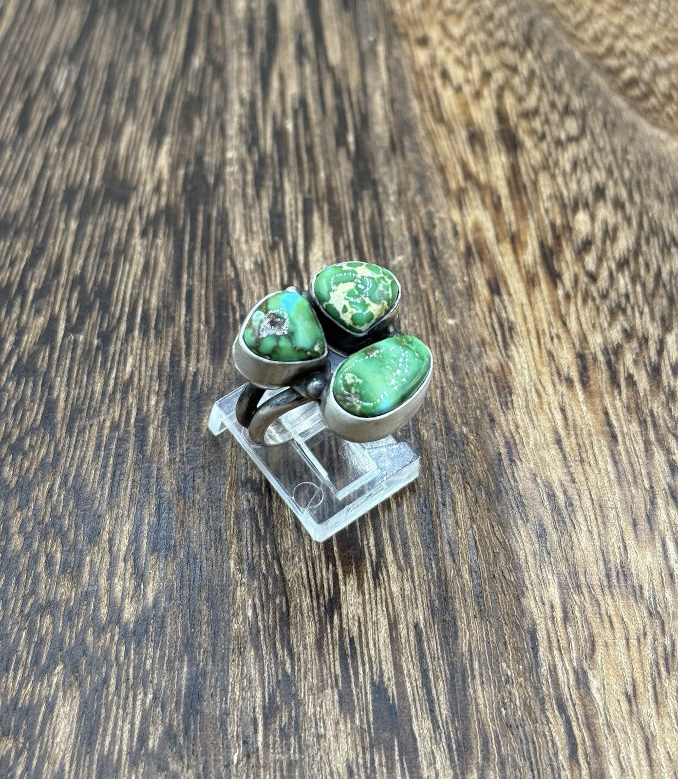 This is a handmade Native american ring made by artist Vicky Hicks. The ring is adorned with Sonoran gold turquoise stones and sterling silver.