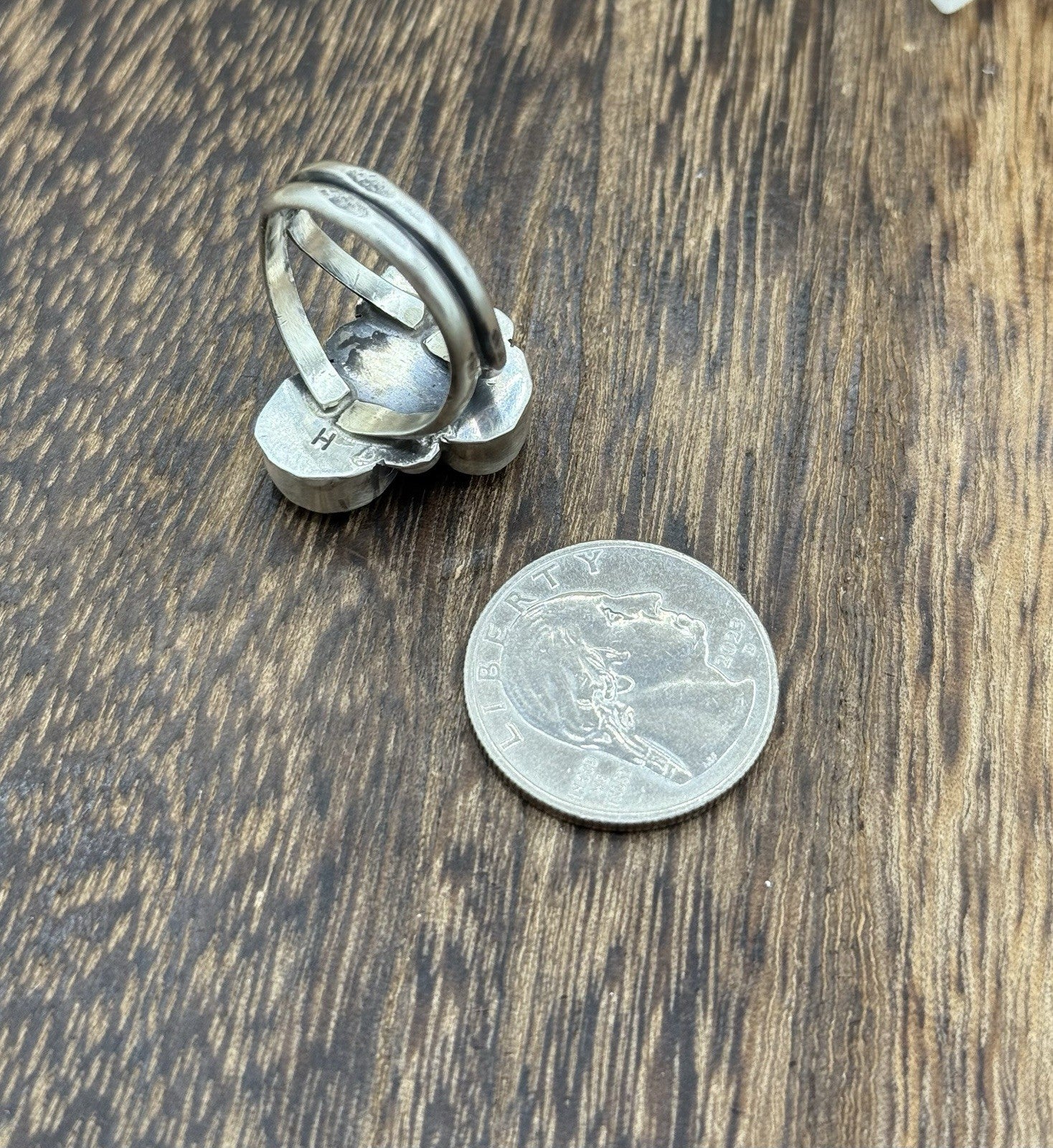 This is a handmade Native american ring made by artist Vicky Hicks. The ring is adorned with Sonoran gold turquoise stones and sterling silver.