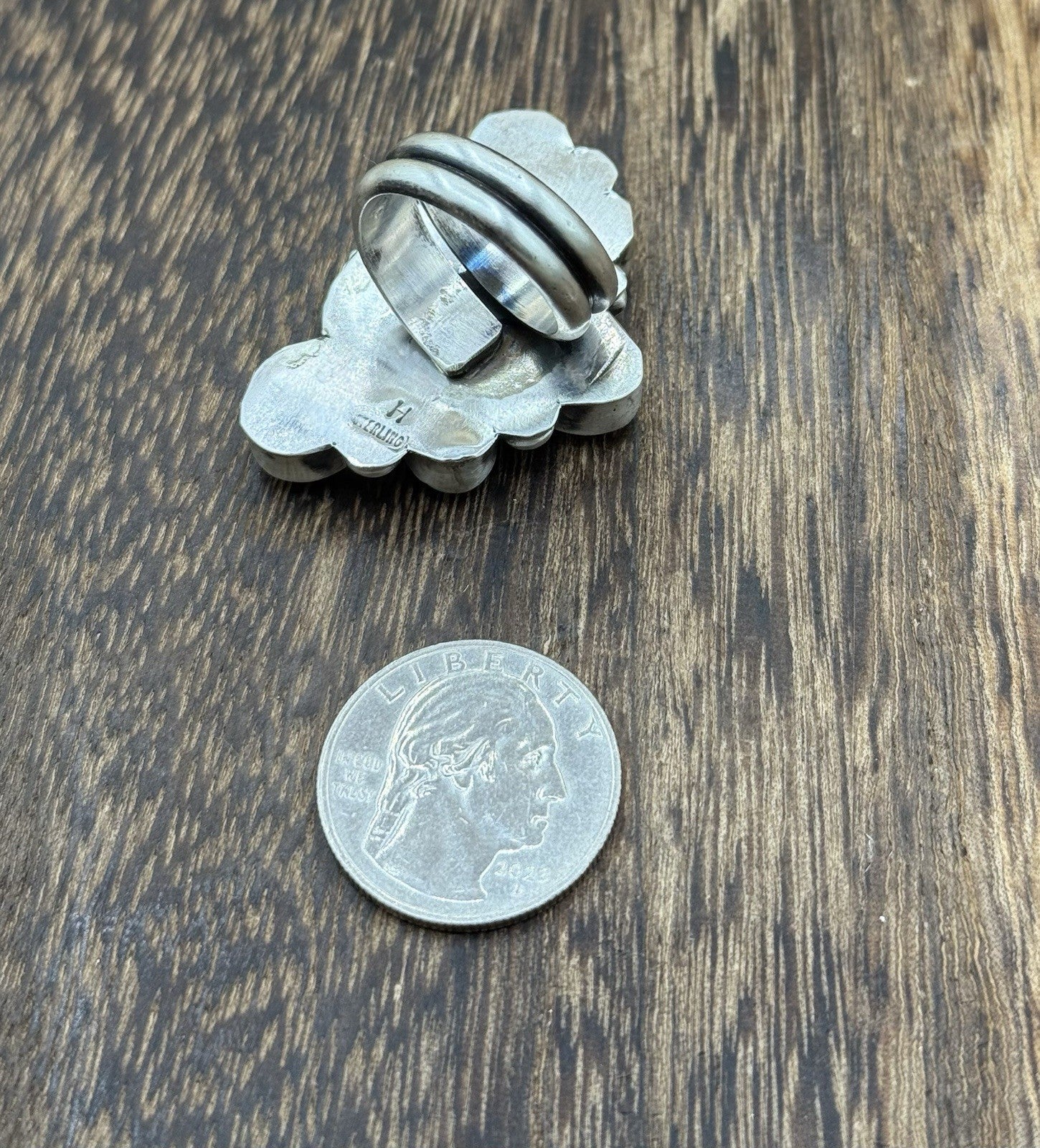 This is a handmade Native american ring made by Vicky Hicks. The ring is adorned with a Sonoran gold turquoise stone. The ring is a size 8.