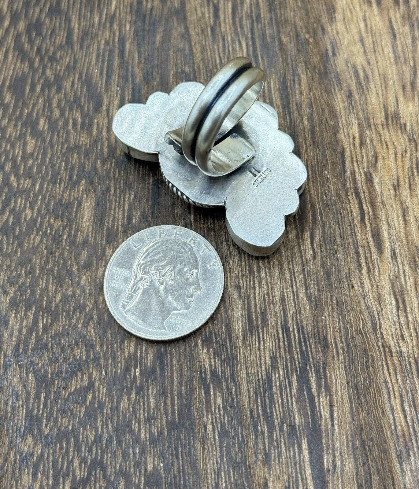 This is a handmade Native american ring made by Vicky Hicks. The ring is adorned with a Sonoran gold turquoise stone. The ring is a size 8.
