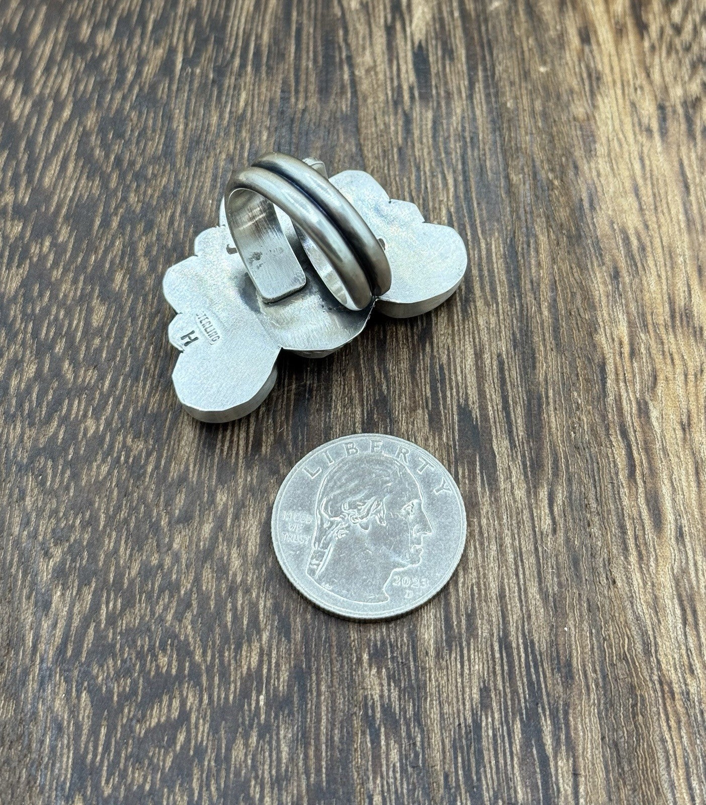 This is a handmade Native american ring made by Vicky Hicks. The ring is adorned with a Sonoran gold turquoise stone. The ring is a size 8.
