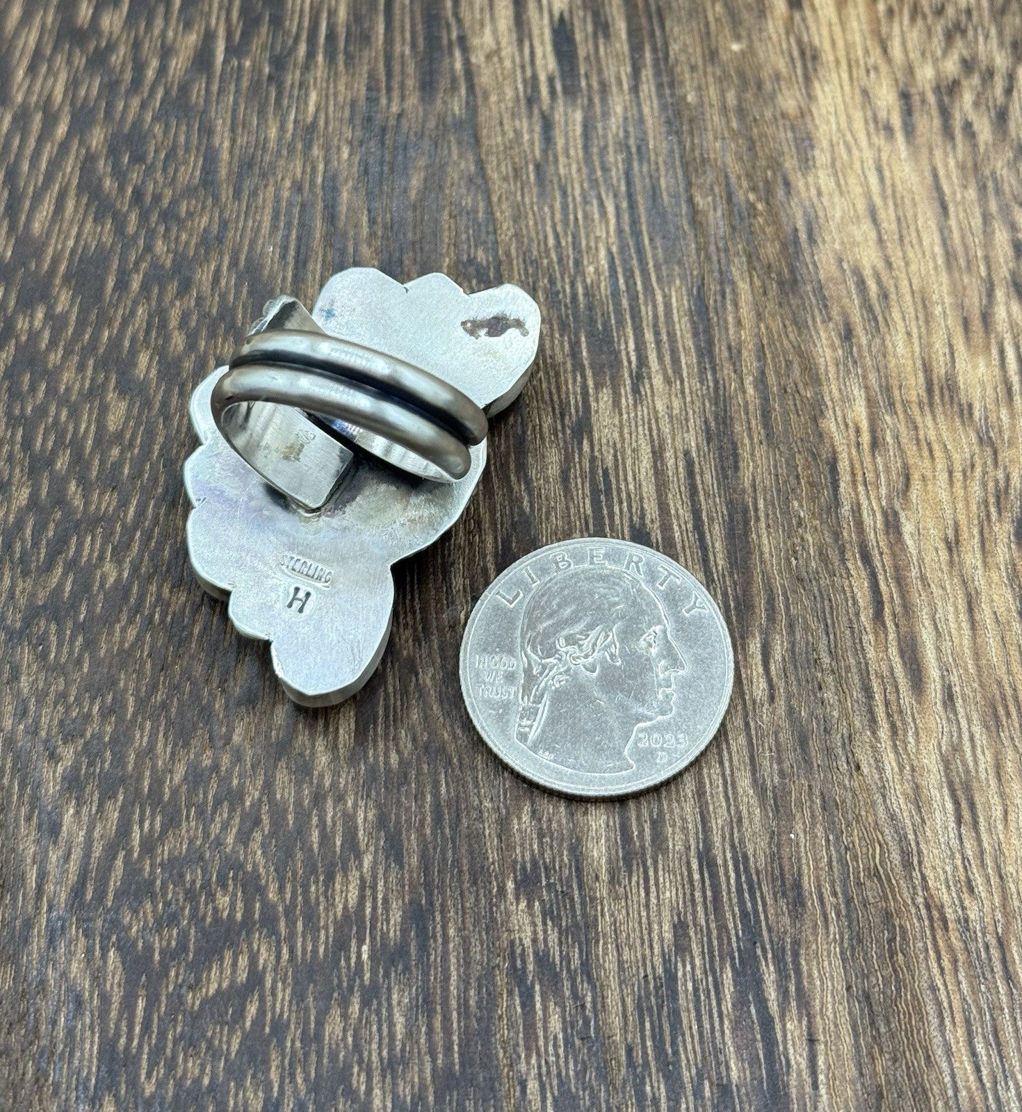 This is a handmade Native american ring made by Vicky Hicks. The ring is adorned with a Sonoran gold turquoise stone. The ring is a size 8.