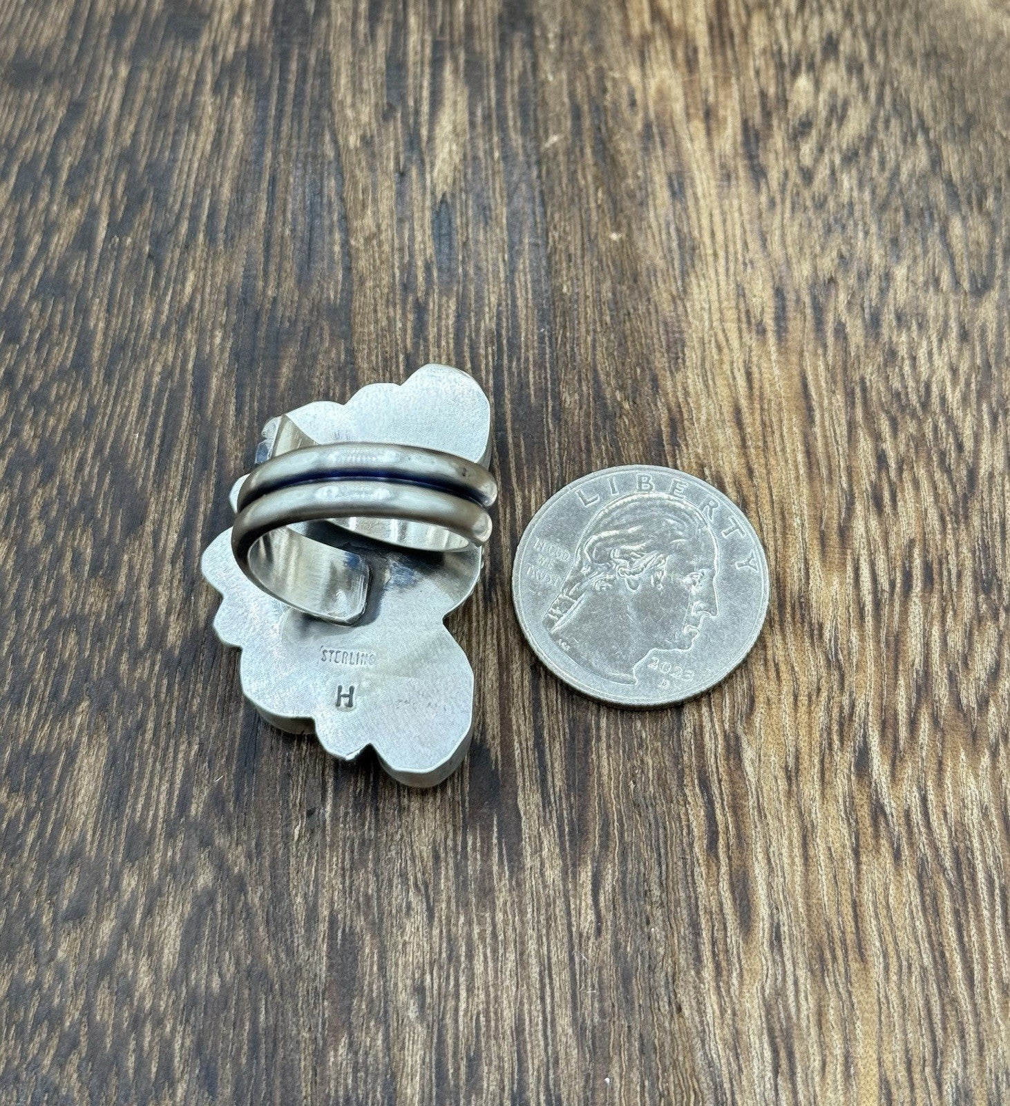This is a handmade Native american ring made by Vicky Hicks. The ring is adorned with a Sonoran gold turquoise stone. The ring is a size 8.
