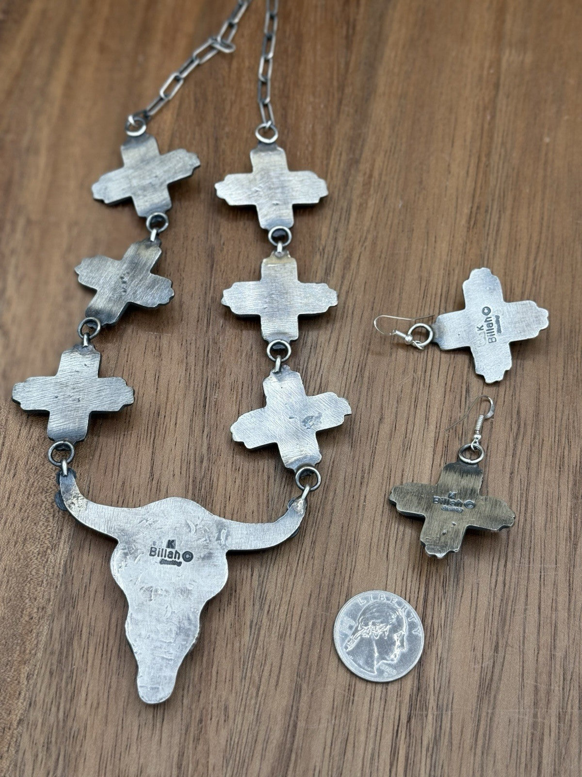 Navajo Handmade Sterling Silver Sonoran Gold Turquoise Longhorn Zia Necklace Set