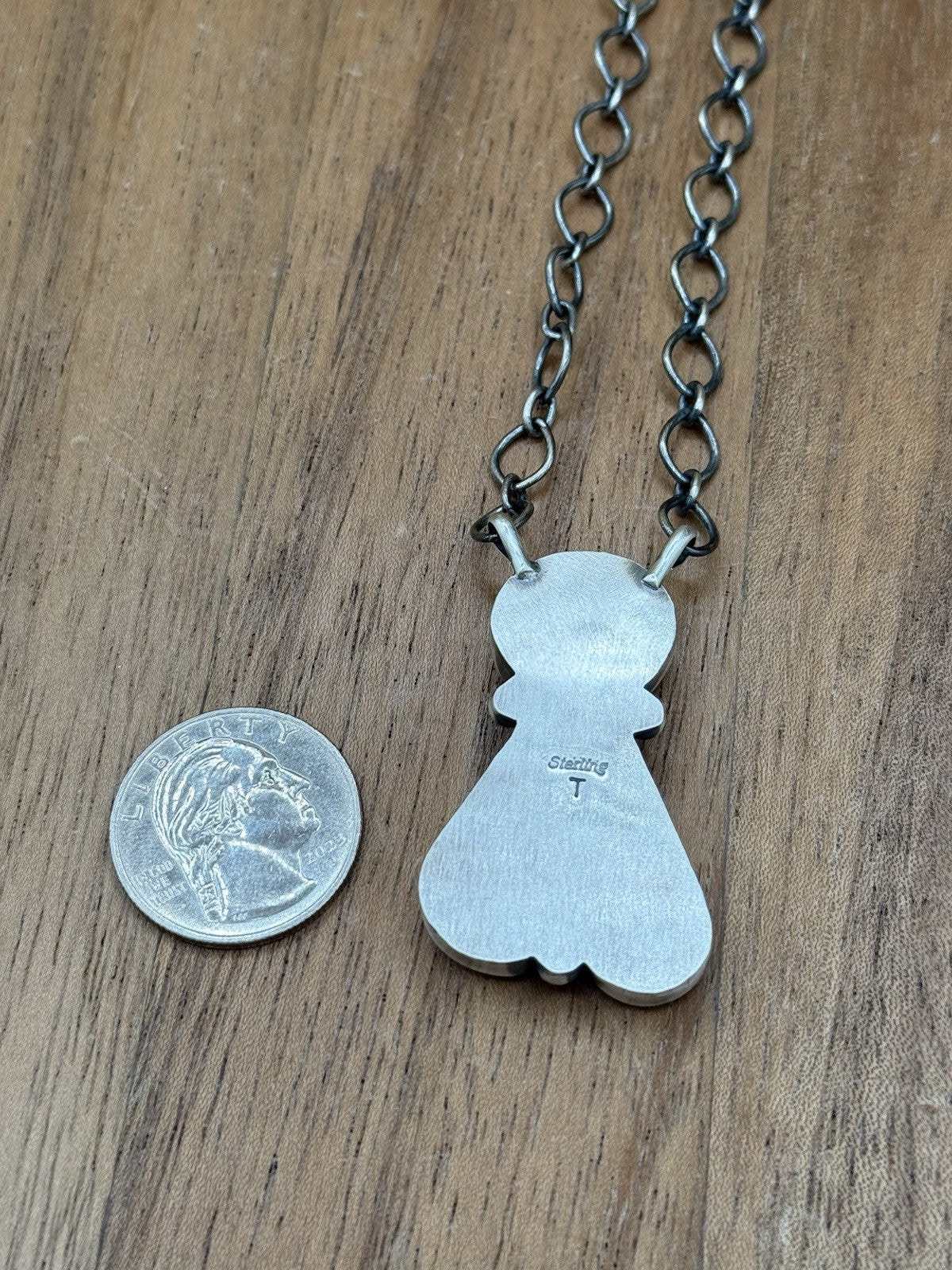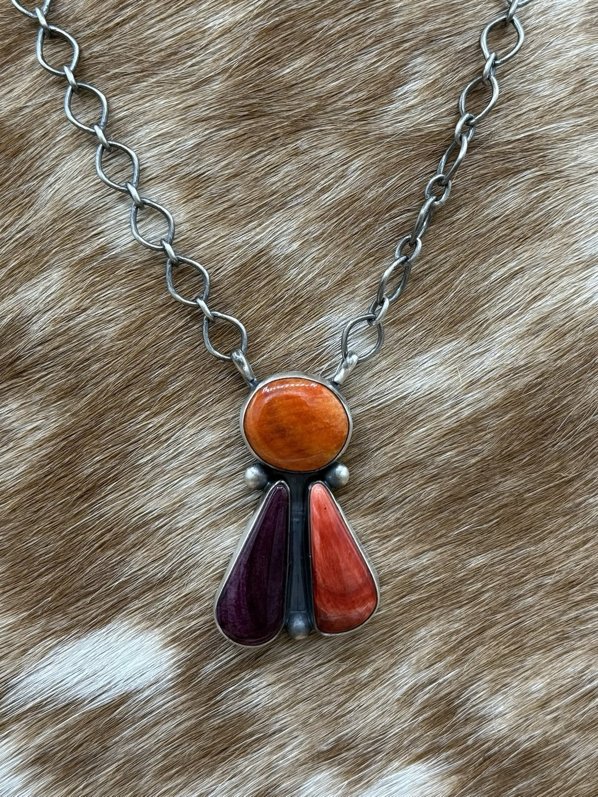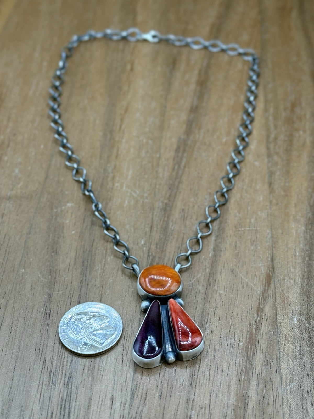 This exquisite necklace is a true work of art handcrafted by Native American artisan Tricia Smith, The stunning cluster bar shaped necklace features beautiful spiny oyster shell stones set in sterling silver bezel. The pendant hangs on an 18-inch chain with lobster closure, making it a perfect accessory for any occasion.