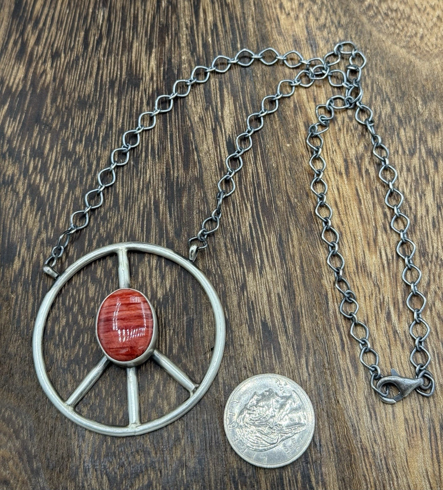 This unique necklace is a beautiful piece of Native American jewelry. Handmade by Navajo artisan Tricia Smith, it features a peace pendant on chain all crafted from .925 sterling silver and adorned with a spiny oyster shell stone. The necklace is 18 inches long and comes with a lobster closure.