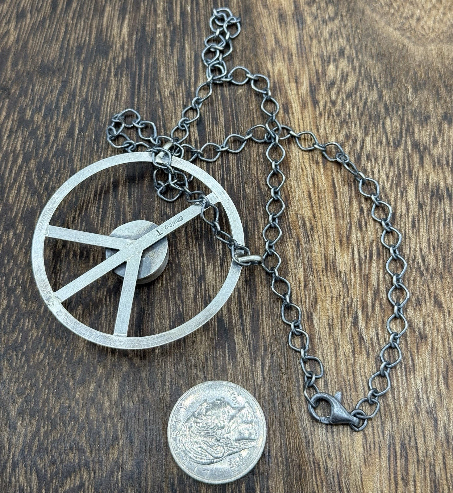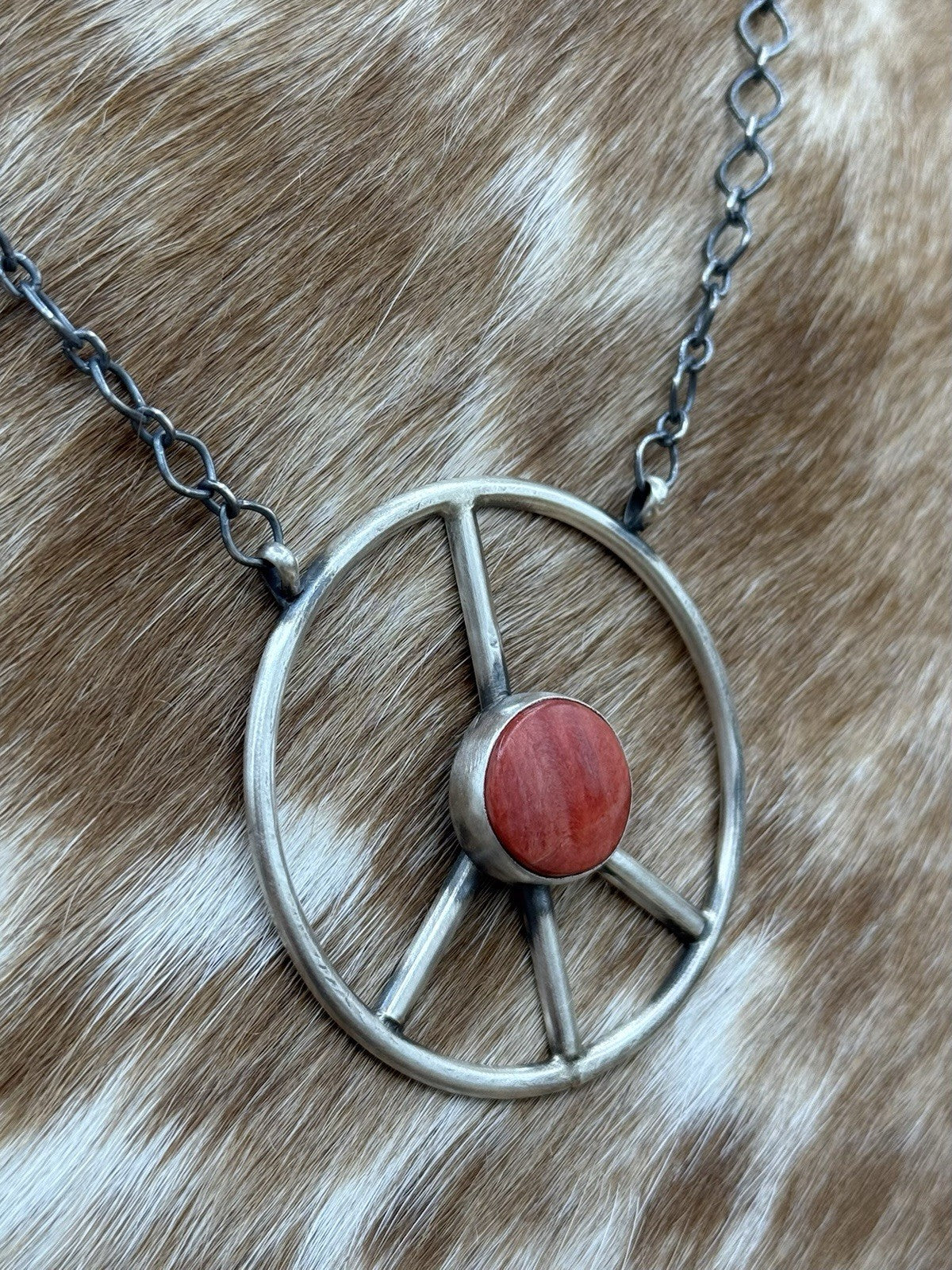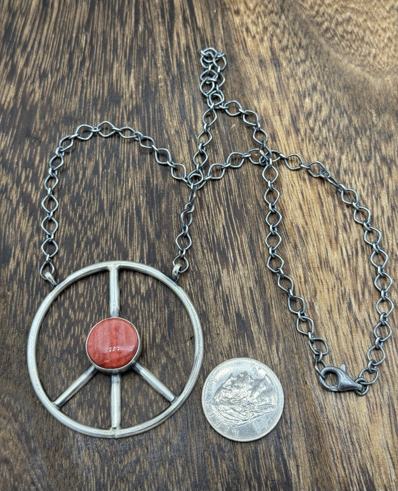 This unique necklace is a beautiful piece of Native American jewelry. Handmade by Navajo artisan Tricia Smith, it features a peace pendant on chain all crafted from .925 sterling silver and adorned with a spiny oyster shell stone. The necklace is 18 inches long and comes with a lobster closure.