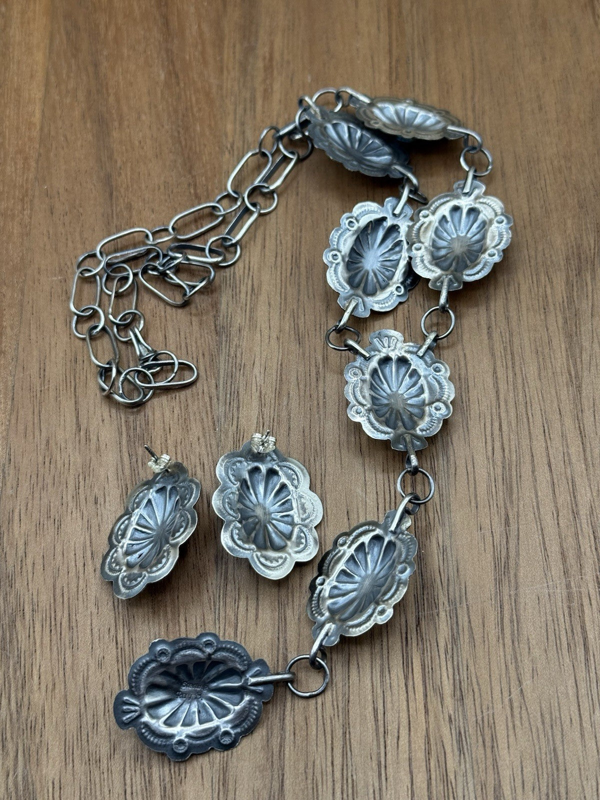 Navajo Handmade Sterling Silver Stamped Concho Turquoise Lariat Necklace Set 24”