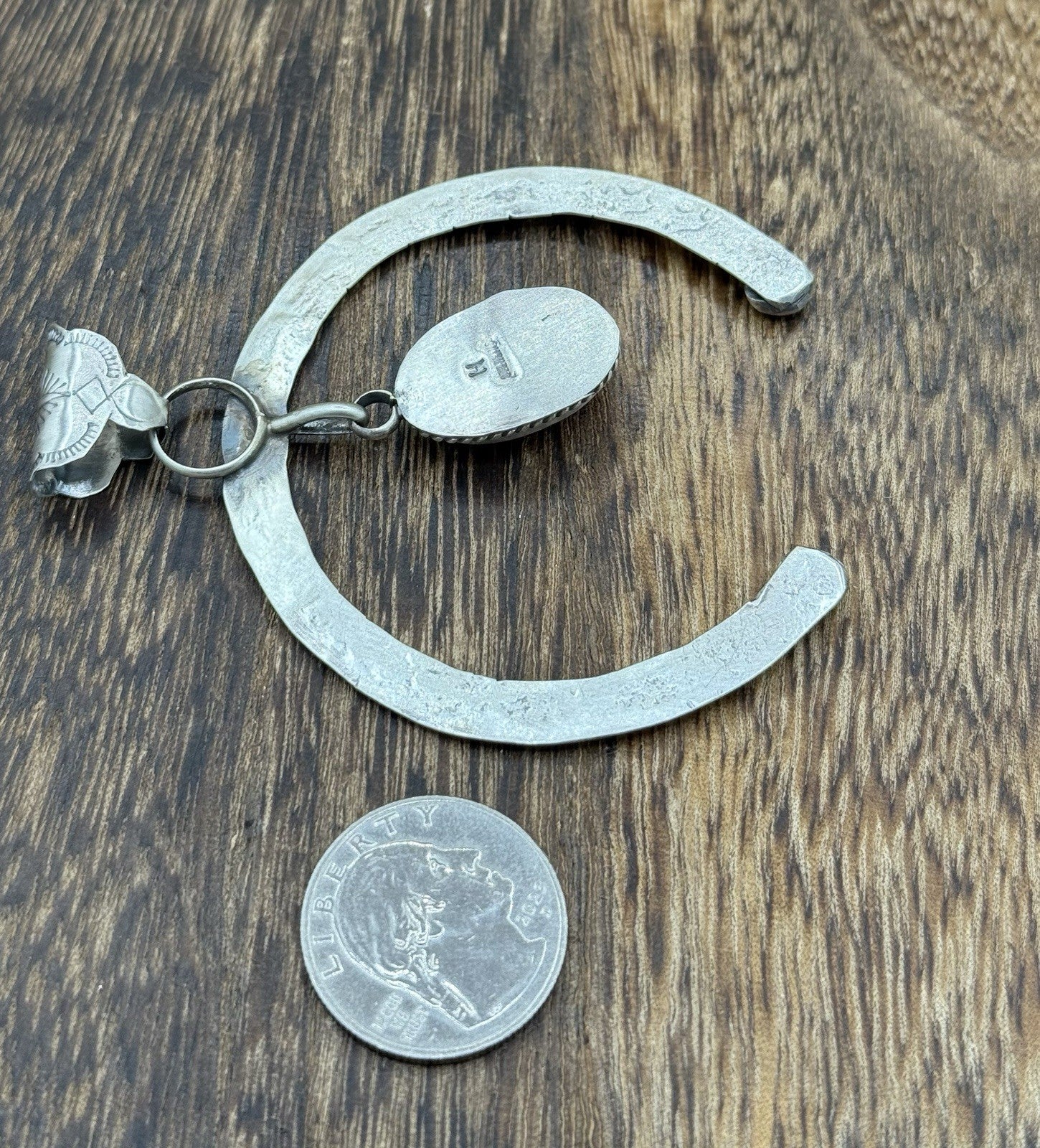 This beautiful pendant is a true work of art. Handmade by Vicky Hicks, a Native American artisan, it features a unique dangle shape and a bezel setting style. The pendant is made of 925 sterling silver and adorned with a stunning spiny oyster stone.