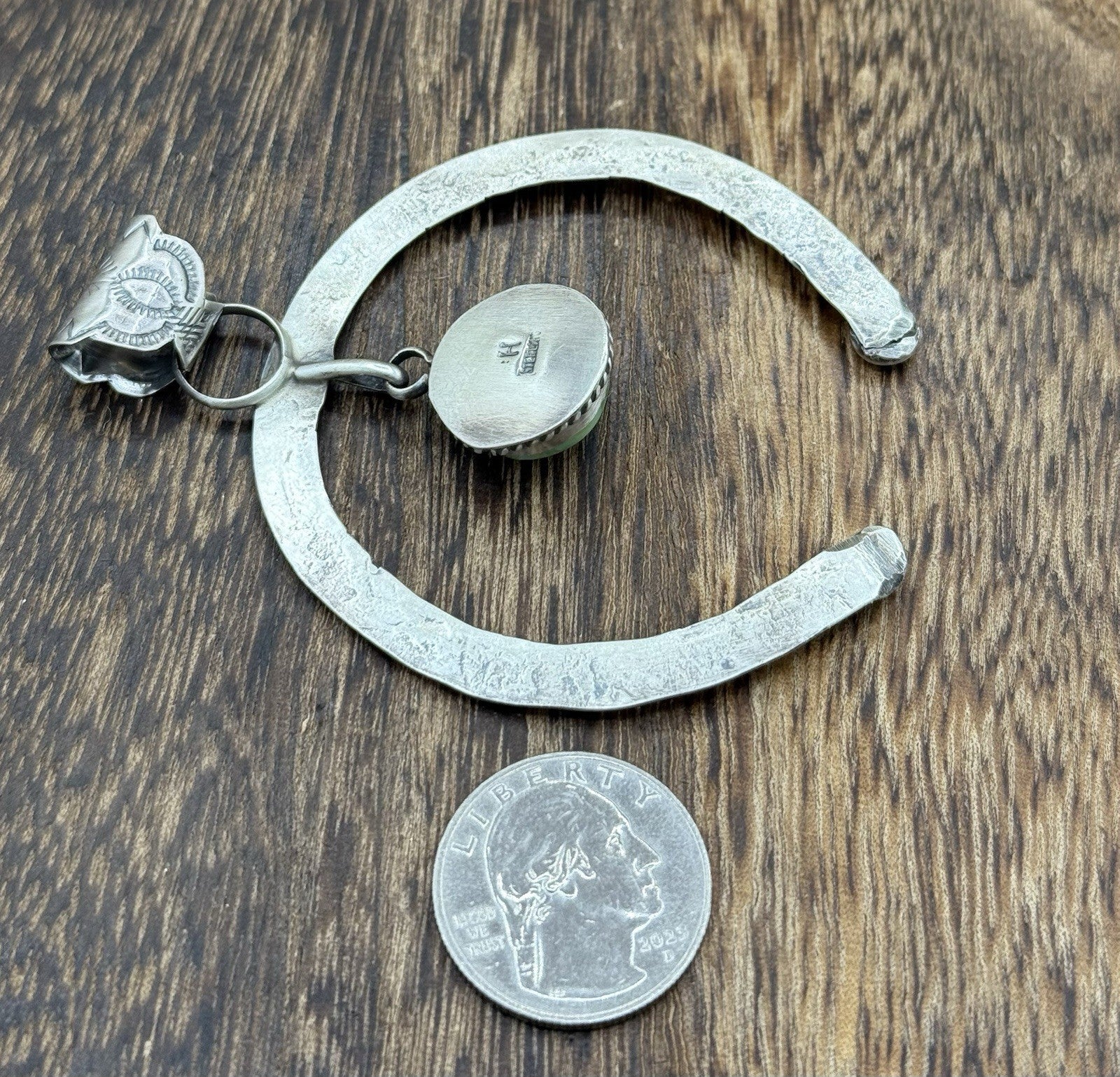 This beautiful pendant is a true work of art. Handmade by Vicky Hicks, a Native American artisan, it features a unique dangle shape and a bezel setting style. The pendant is made of 925 sterling silver and adorned with a stunning turquoise stone.