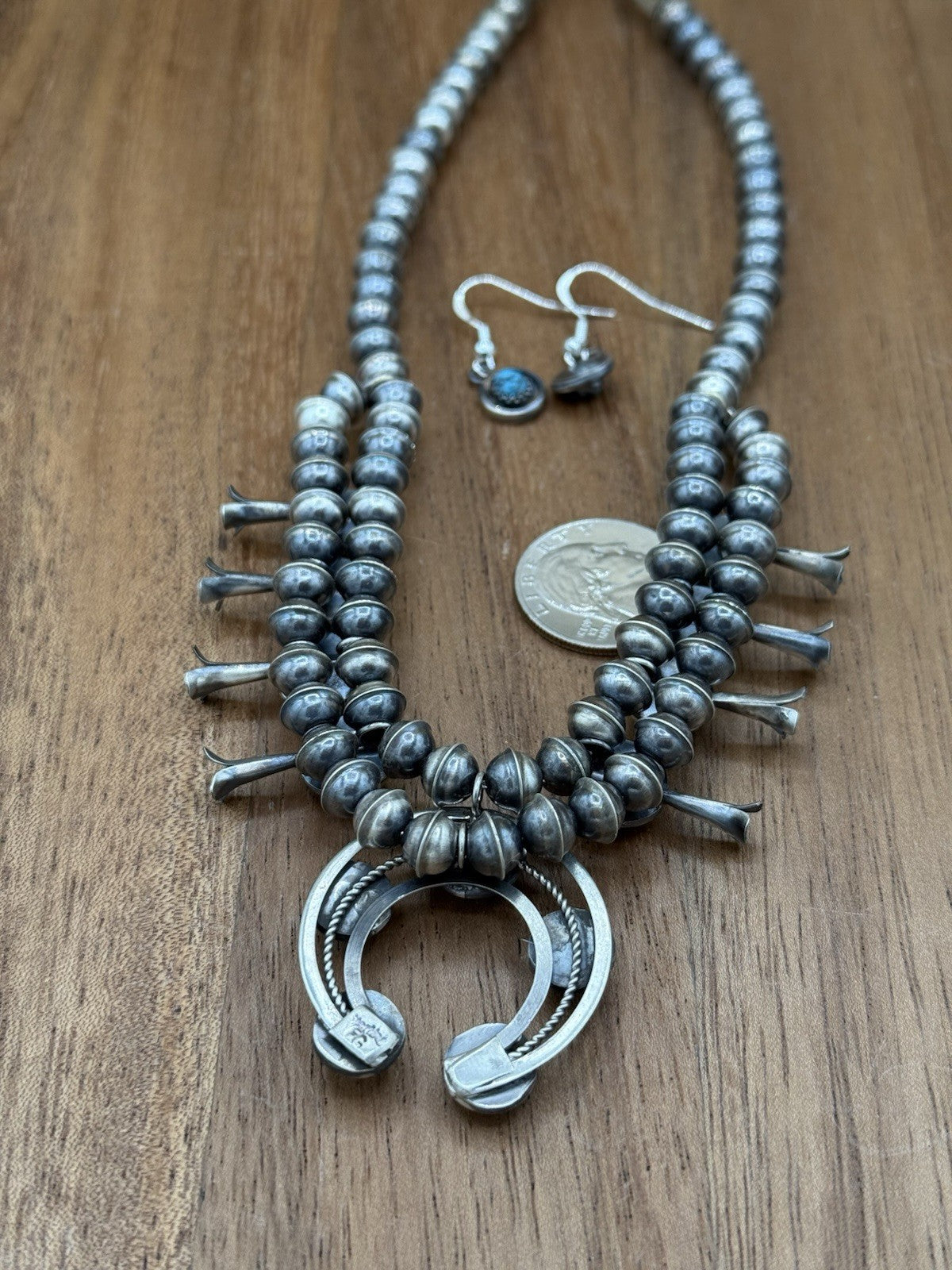 Navajo Handmade Sterling Silver Turquoise Shadowbox Squash Blossom Necklace 17”