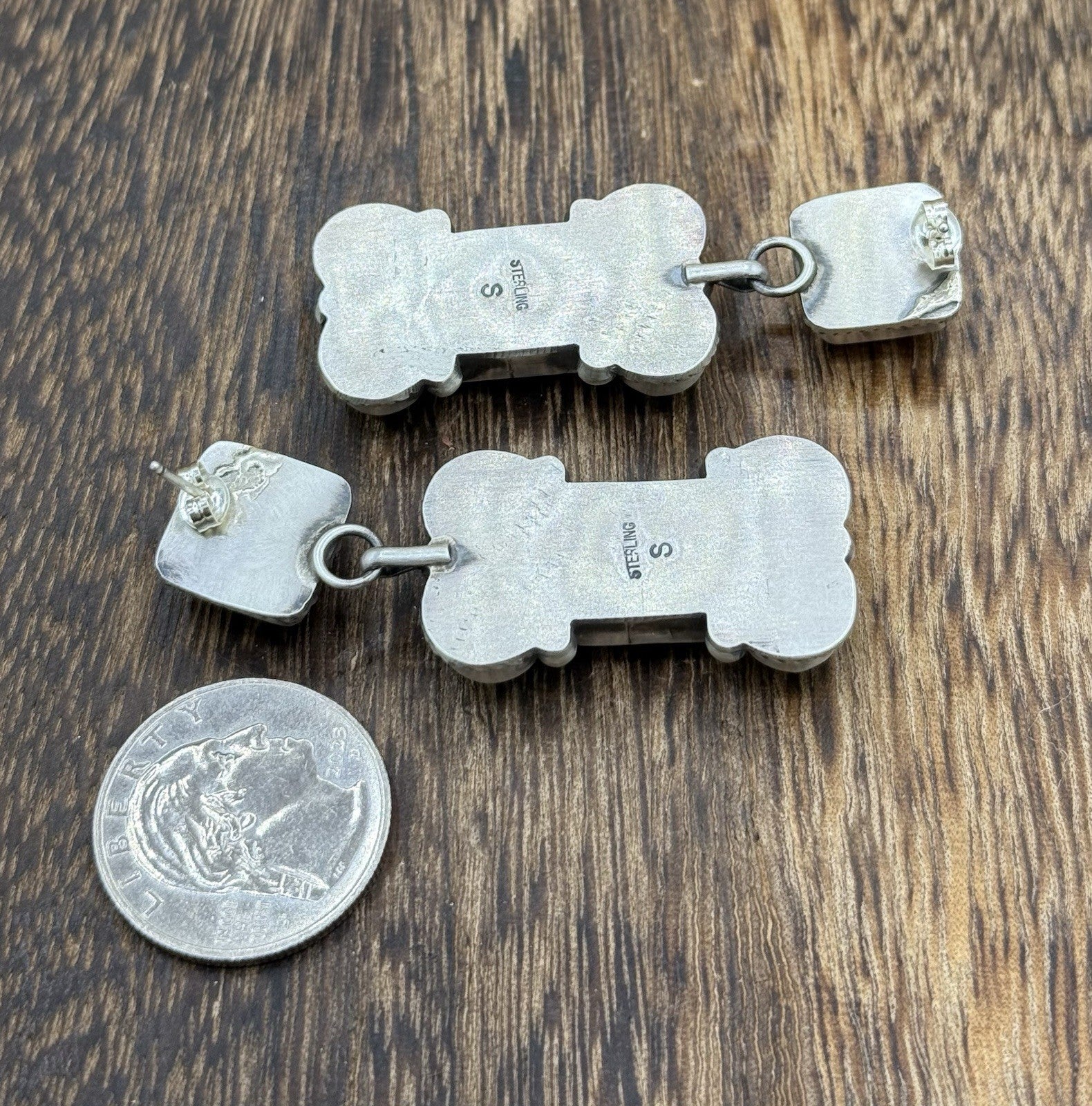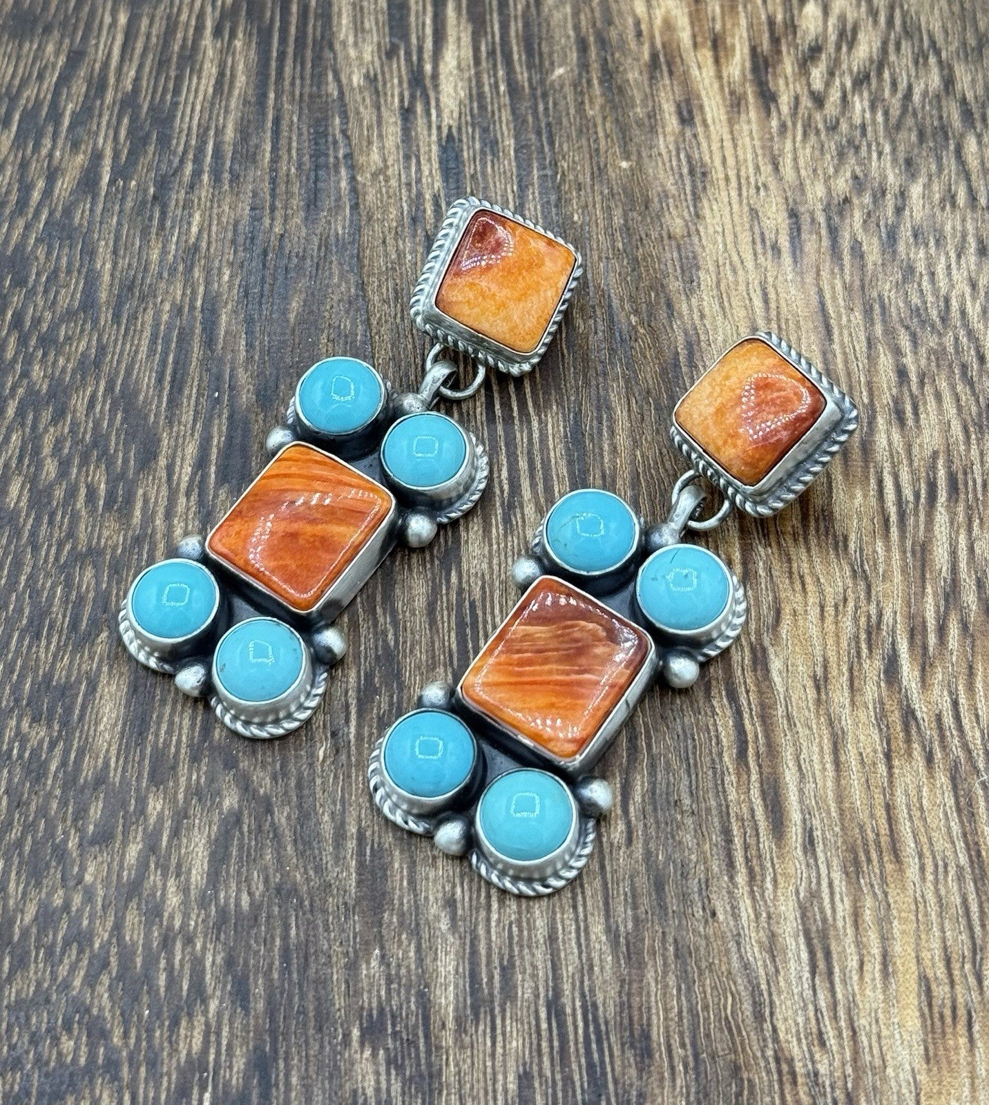 Navajo Handmade Sterling Silver Turquoise & Spiny Oyster Post Dangle Earrings